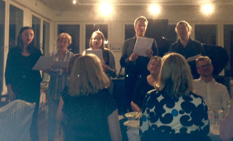 Efter konserten går vi alla hem till Janne och Marina som dukat upp för hela kören inklusive avec-ar. Jag har tre stycken av samma kön. De blir varmt emottagna och antagna som körmedlemmar. Maten är god och dryckerna flödar. Snapsvisorna skallar.