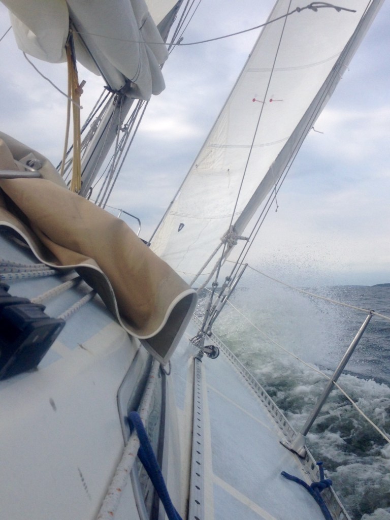 Darling Lilly går fint genom sjön. Stundvis får vi göra stagvändningar tätt. Gasten får jobba hårt medan rorsman har det lättare. Vi byter plats utanför Helsingfors. Målet för dagen får bli Porkala Marin. Butiken har stängt, men bastun är varm. Jag tillreder en pestopasta med makrill innan vi badar bastu och kryper till kojs.