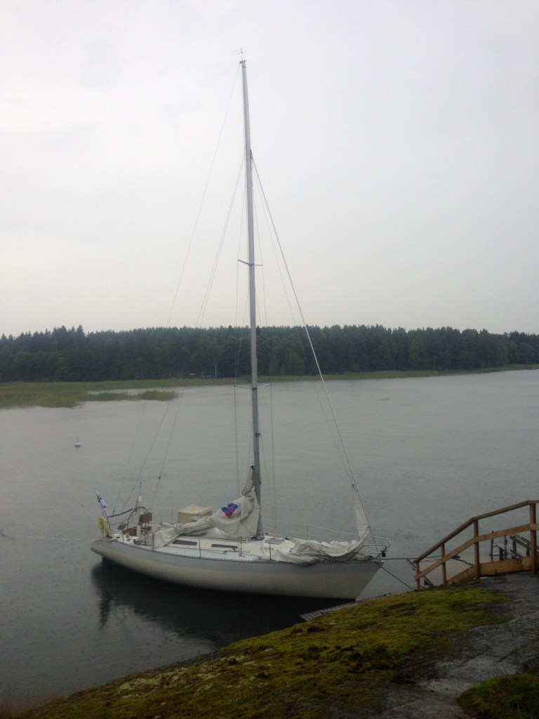 startar vi, Petski och jag, från Björnsö på onsdag morgon. Vi går för motor och hissar segel utanför Nordsjö. Det blåser en stadig sydvästlig vind så vi har en hård kryss att vänta. För säkerhets skull och av bekvämlighetsskäl har vi tagit in andra revet på storseglet och focken som försegel.