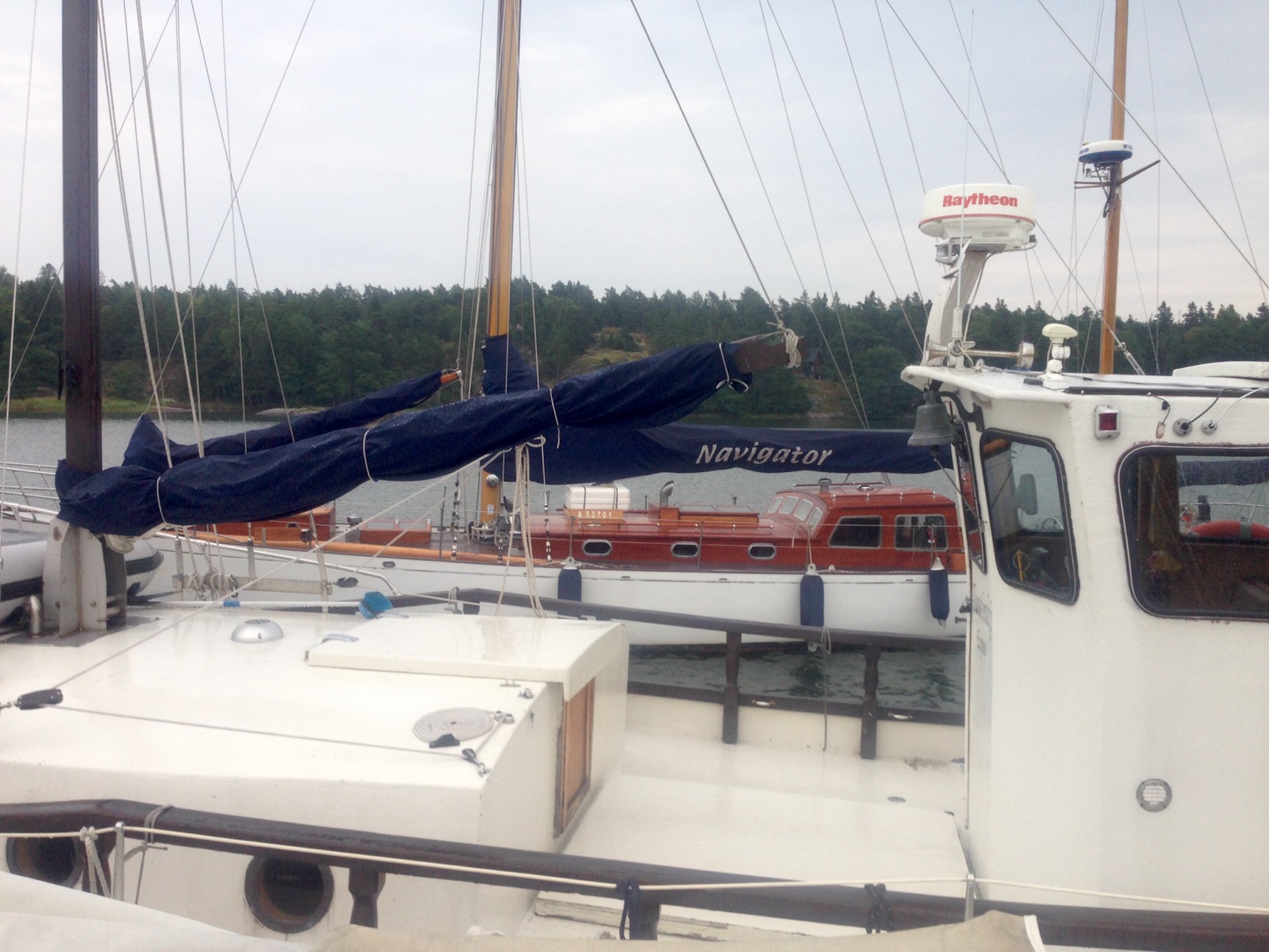 startar vi, Petski och jag, från Björnsö på onsdag morgon. Vi går för motor och hissar segel utanför Nordsjö. Det blåser en stadig sydvästlig vind så vi har en hård kryss att vänta. För säkerhets skull och av bekvämlighetsskäl har vi tagit in andra revet på storseglet och focken som försegel.