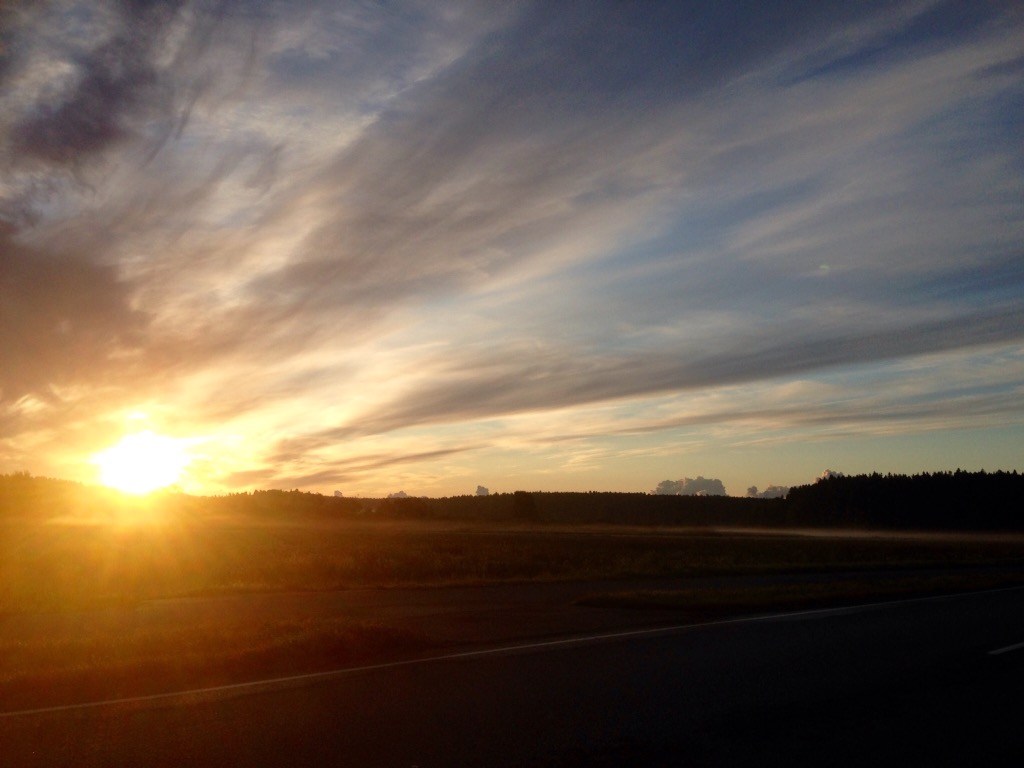 Beger mig iväg i gryningen. Solen stiger upp och belyser molnen och de älvdansöverdragna åkrarna. Jag har tidigare beundrat dessa scener på väg från Backa till Hemvikshamnen. Jag stannar, vevar ned fönstret och fotograferar flera gånger under färden.