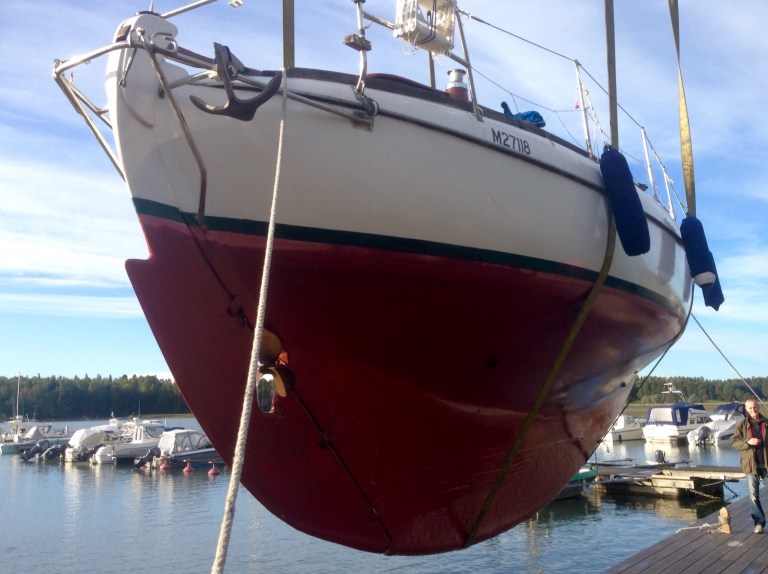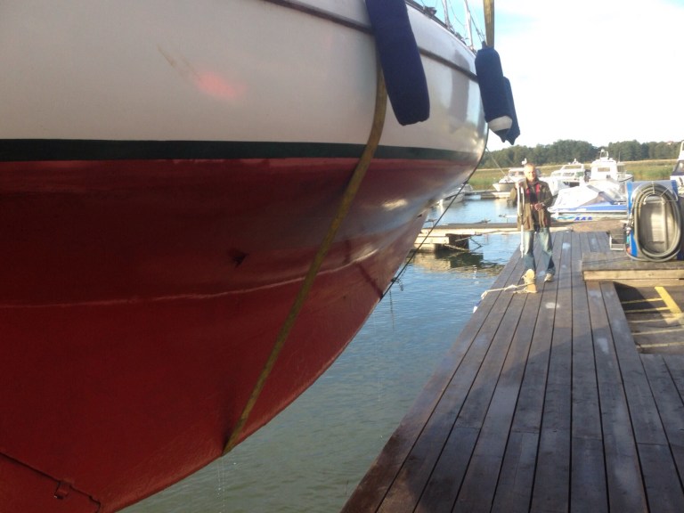 Vi är bara fyra som skall lyfta idag. Jag är den tredje. Den första är redan på plats med sin H-båt. Jag har klippt en matta för att lägga på bockens stödarmar. På båten skruvar jag loss stag och vanter. Lämnar förstaget och huvudvanterna. Slinter på det daggvåta däcket och tappar bilnycklarna. Lyckligtvis inte i sjön utan i sittbrunnen. Motorn startar efter en stunds glödgande. Jag kastar loss och puttrar mot lyftstället. Föregående båt är ännu i sjön. Jag fäster mig vid en boj och sätter mig att vänta. Så fort kajen blir ledig tar jag mig dit. Marc tar emot. Han är i tur efter mig. Vi hjälper varandra.