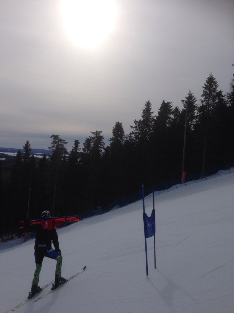 Lördag morgon gryr lika vacker som fredag. Idag storslalom. Nervositeten inför start drev mig på flera toalettbesök med orolig mage. Det sista minuterna före start. Åken var mediokra, resultatet igen en femte plats av 10 åkare. Förväntningarna var stora men utförandet skralt. Har jag inget vettigare att göra? Men i morgon, slalom, min specialgren.