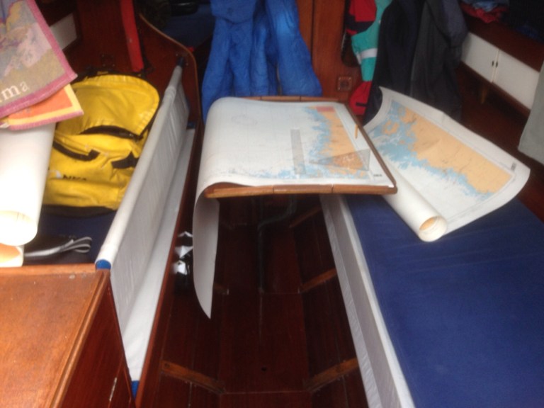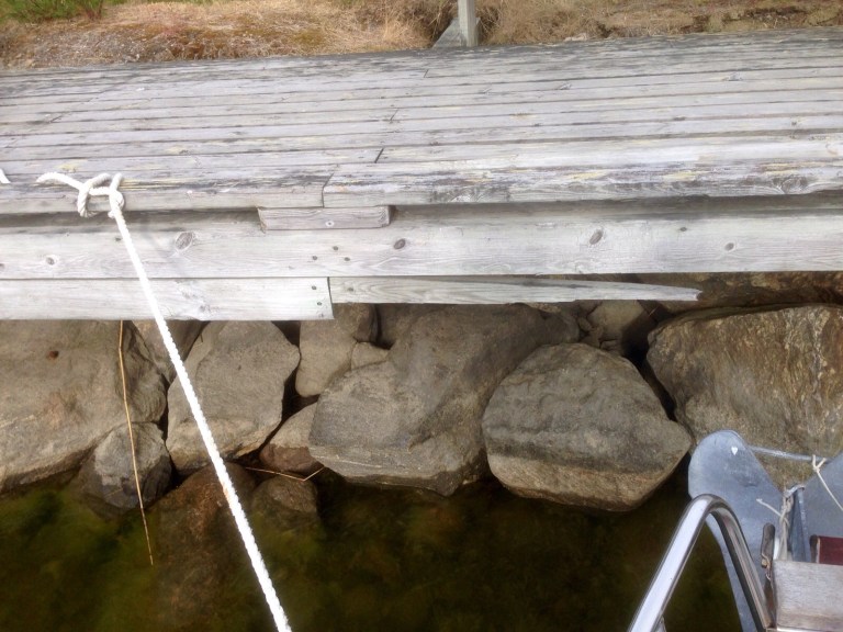 En av fördelarna med att segla ”själv” är att man kan breda ut grejorna hur man vill. Jag märker ut min position med jämna mellanrum på översiktskorten. Jag siktar först mot Kaskö, men mot eftermiddagen då jag ser att det är 30 sjömil kvar väljer jag att gå mot Kilens hamn i Sideby. Vinden har ökat så jag håller fart mot bryggan för att inte driva undan. Fören tar lätt i den, som det visar sig, murkna bryggan.