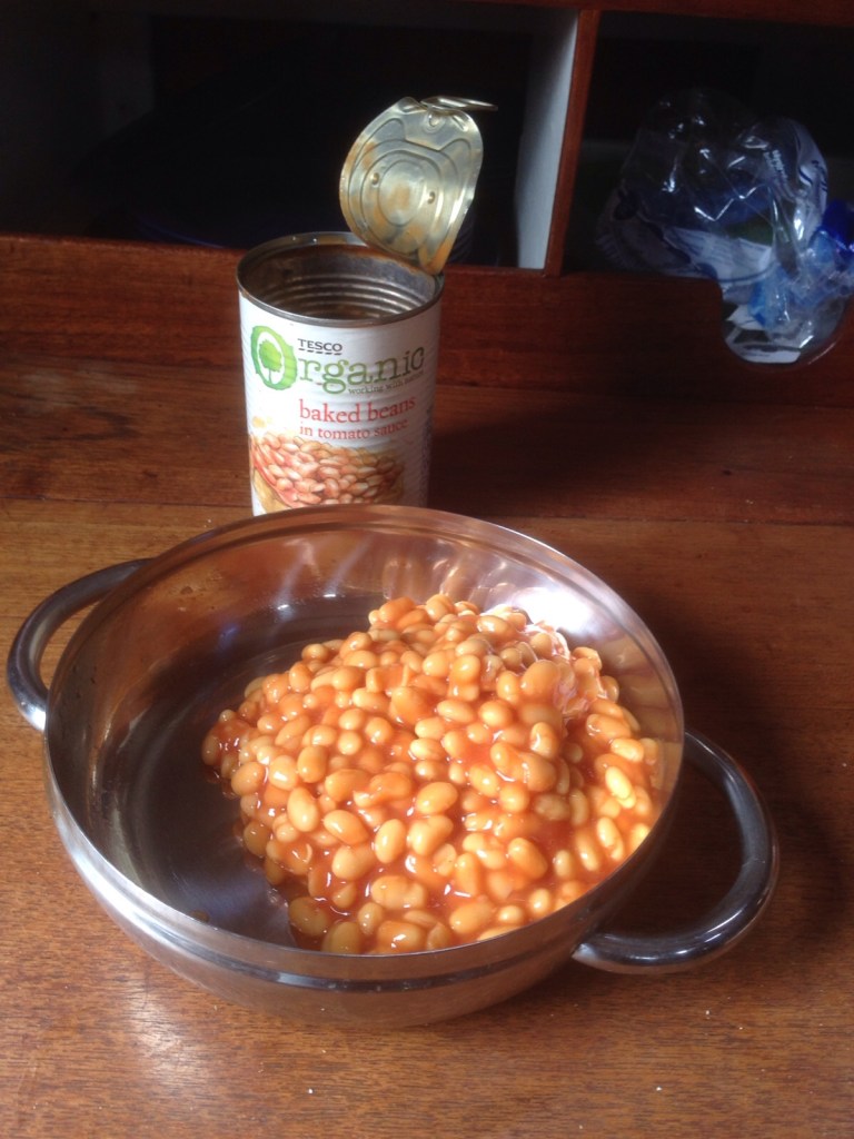 Baked beans in tomato sauce. Organic och allt! Nedskjöld med den sista ölburken som fanns i pilsen.