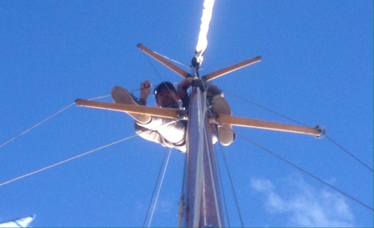 Jag ställer tillbaka stegen och meddelar att det inte lyckas. Fredrik erbjuder sig att låta sig vinschas upp i masten. Eftersom han är betydligt yngre och lättare än jag tar jag tacksamt emot förslaget.