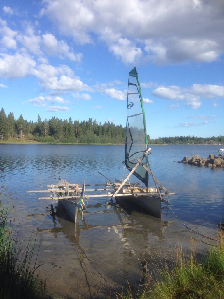 Träffade en gubbe på Ratan som byggt detta flytetyg åt sig. Han hade varit ute och seglat med den, det missade jag tyvärr, men när han kom iland i långa joggingbyxor blev han våt till knäna. När han bar hjälpmotorn till bilen slog han sig i slang med mig som nyfiket iakttog. Han började med engelska, men jag svarade på svenska, så vi fortsatte så. Han var försedd med go-pro kamera på pannan och vattentätt fodral för telefonen. En dam ringde honom, men han snäste snabbt av henne och fortsatte tala med mig. Han kom att titta på Freja och vi språkades vid en god stund. Han sade att han var 76 år gammal.