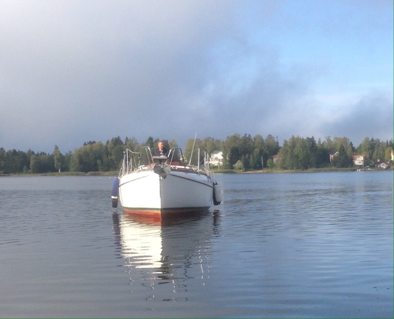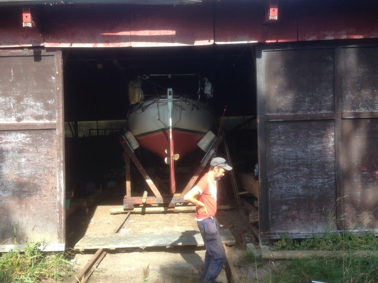 Med mycken möda och stort besvär får vi Freja inbaxad i båthuset. Den övre panelen och mantågsstöttorna måste avlägsnas.