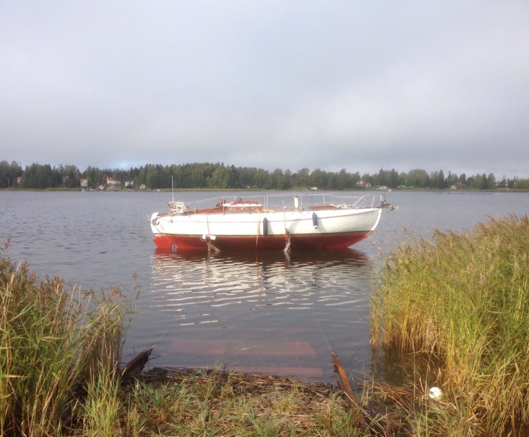 Ett varv till båtvarvet med madrassen jag sov på. Fredrik följer med ut till slipen i en liten rank roddbåt.