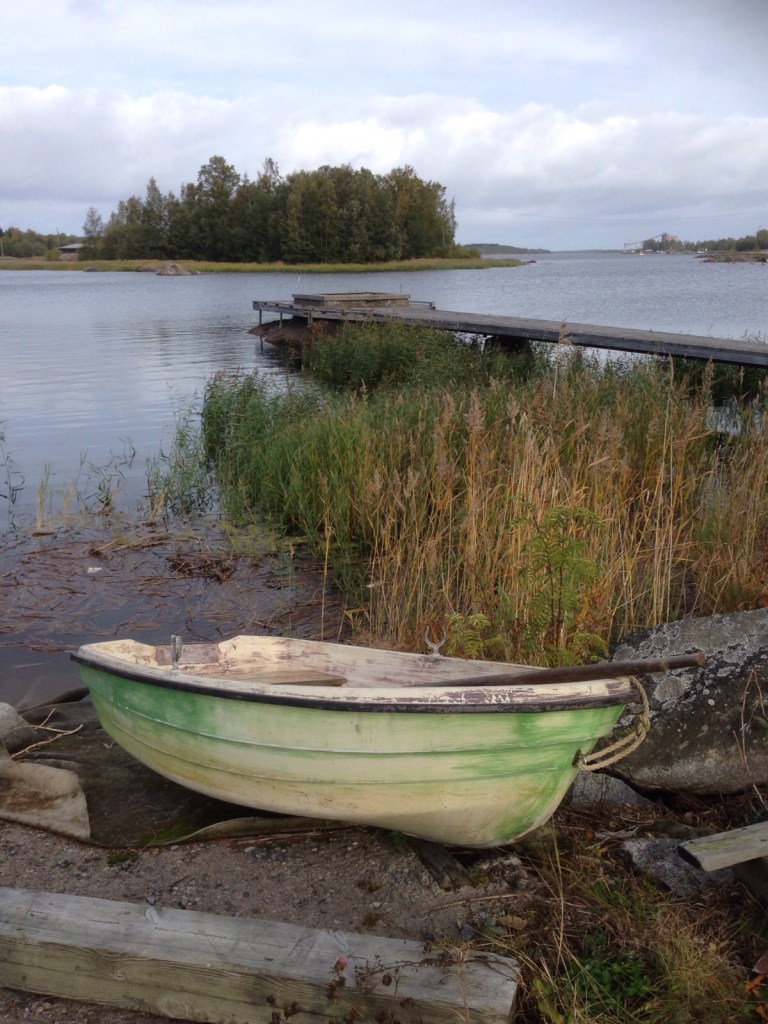 Jollen ligger där den blev lagd. Jag vänder den på rätt köl och embarkerar. Freja finns på den lilla holmen som kan skönjas i bakgrunden. Jag ror med ryggsäcken på ryggen och reflekterar att det hade varit lättare om jag lagt den på aktertoften. Angiven landningsplats är svår att finna i vassruggen. Det blir att på måfå stäva in och skuffa med åran från aktern. Jollen får ligga där den blev.