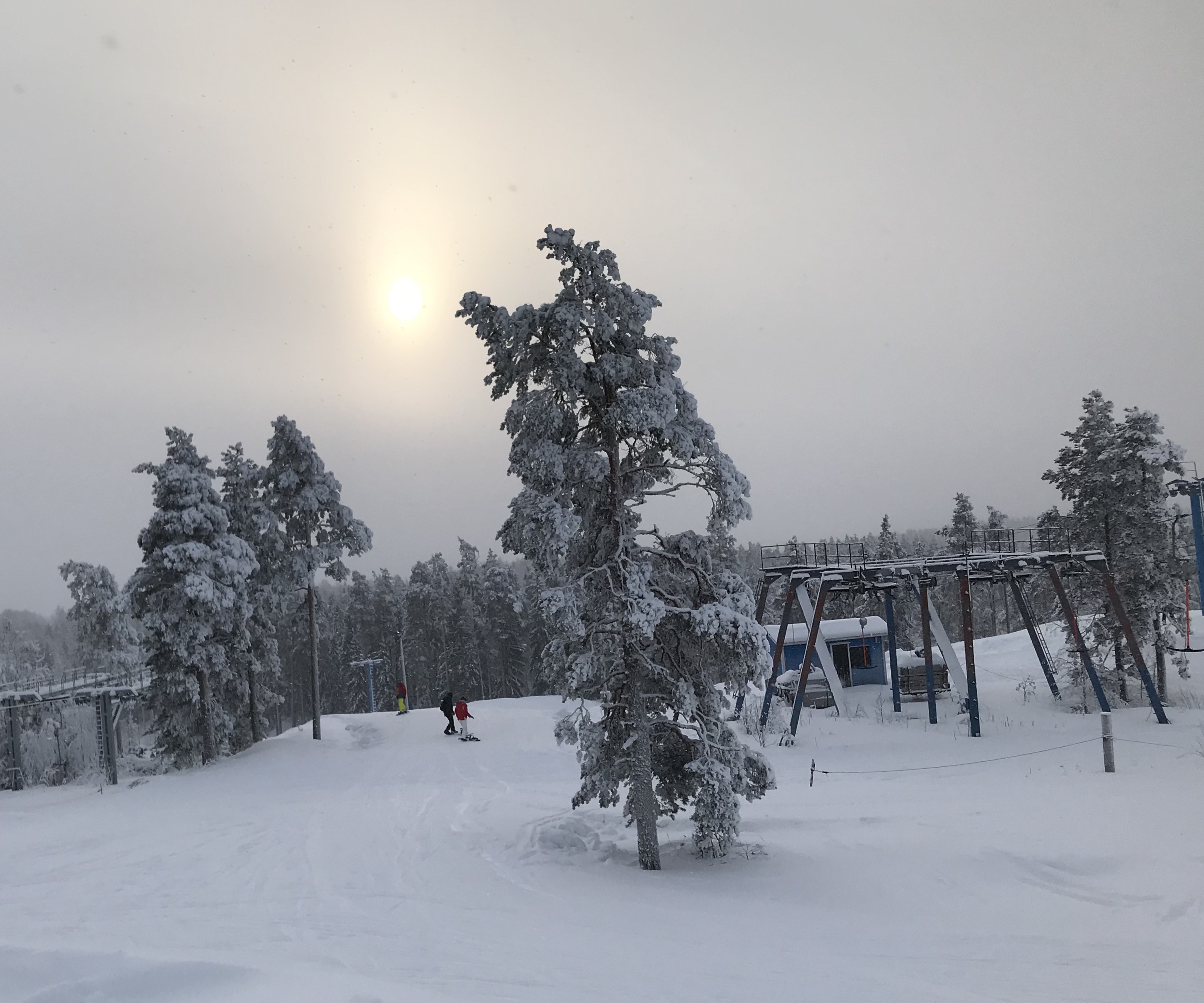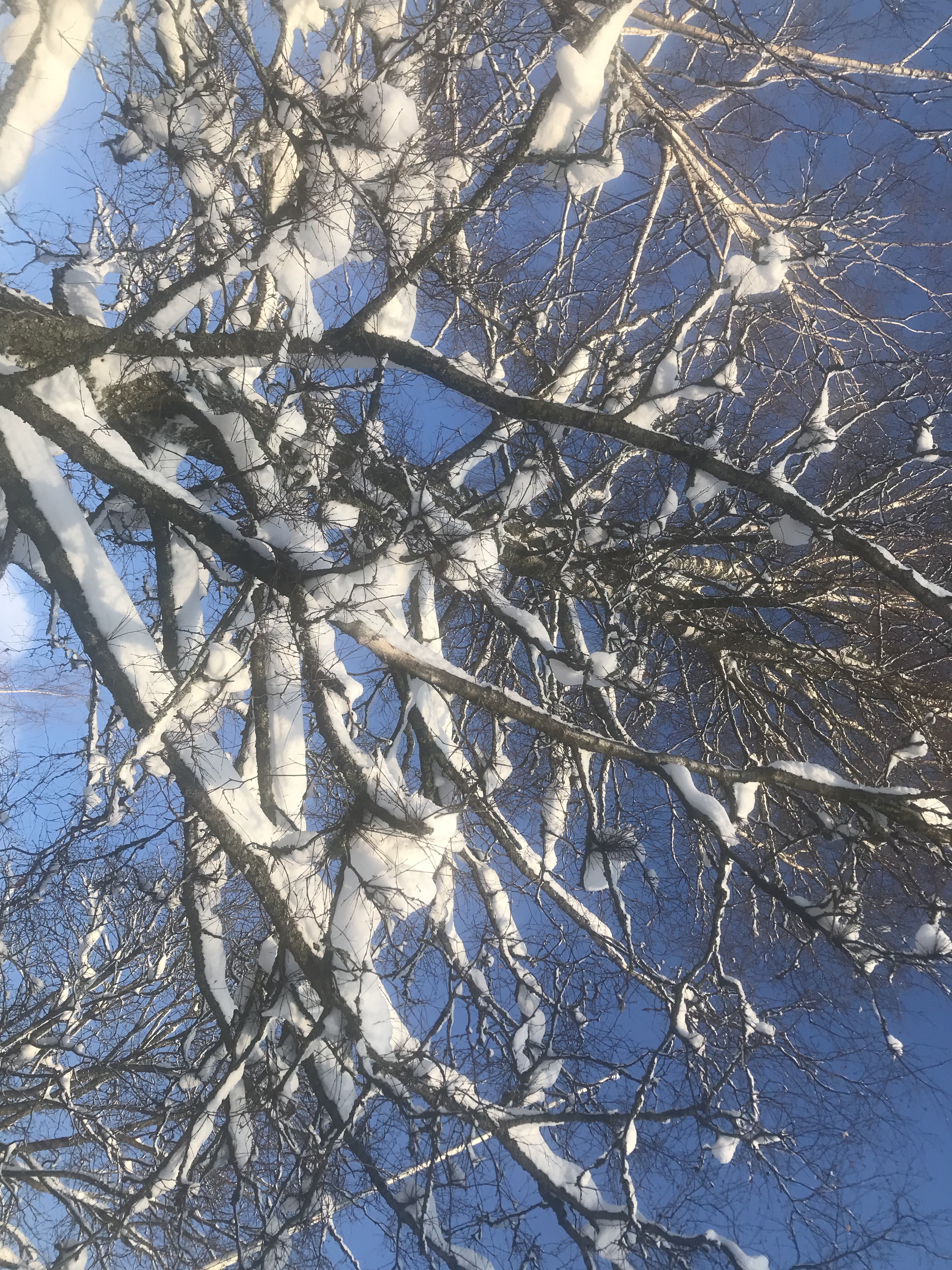 Vintern är som vackrast. Snön som solbelyst behängt trädgrenarna de senaste dagarna ruskas nu ned av den rådande blåsten i väntan på att snötäcket ytterligare skall utökas. Himmel för vintersportare!