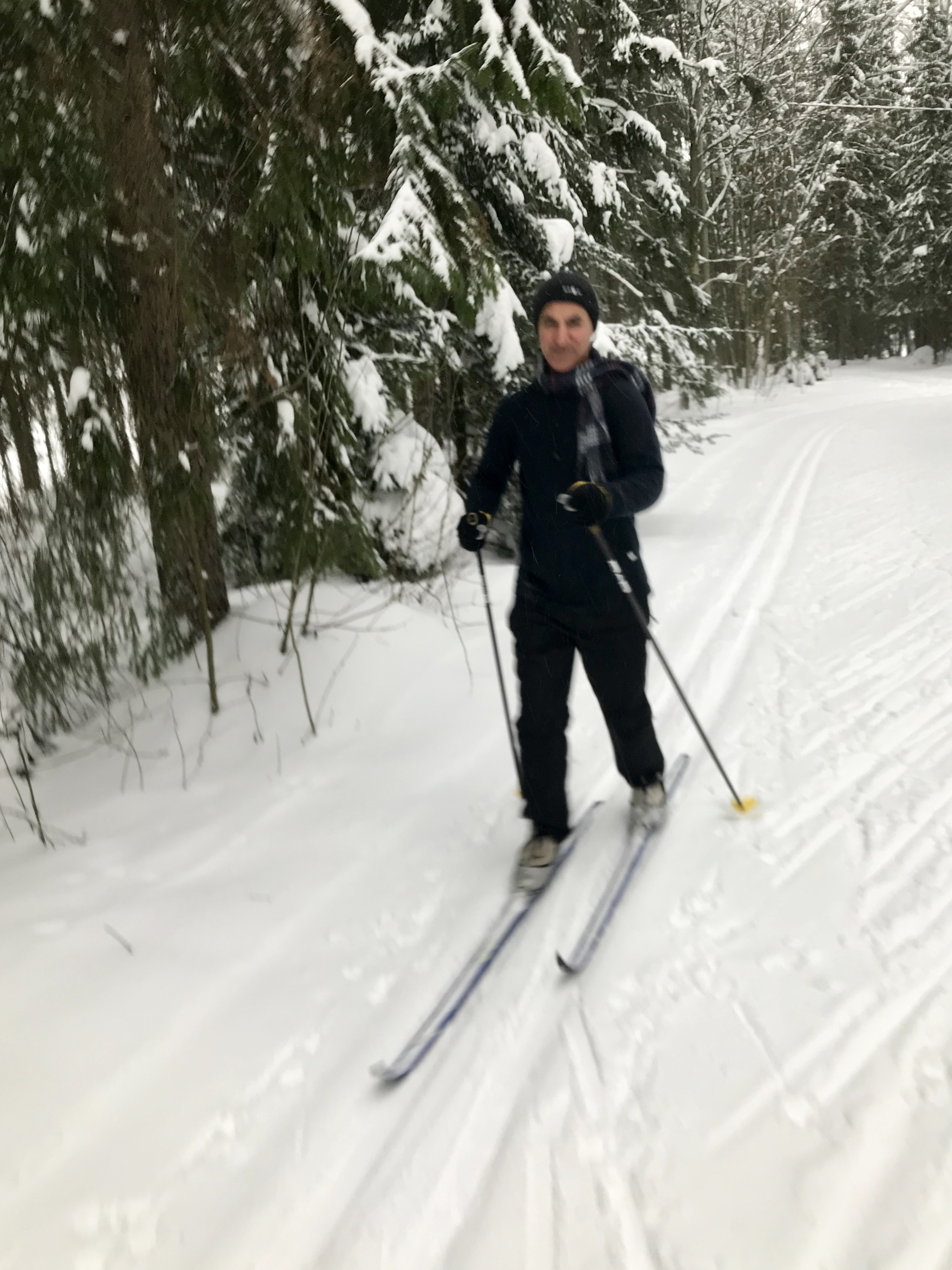 Y blir allt bättre på att skida. Lägger till CV:n: har lärt en asylsökande från Bagdad att åka skidor.