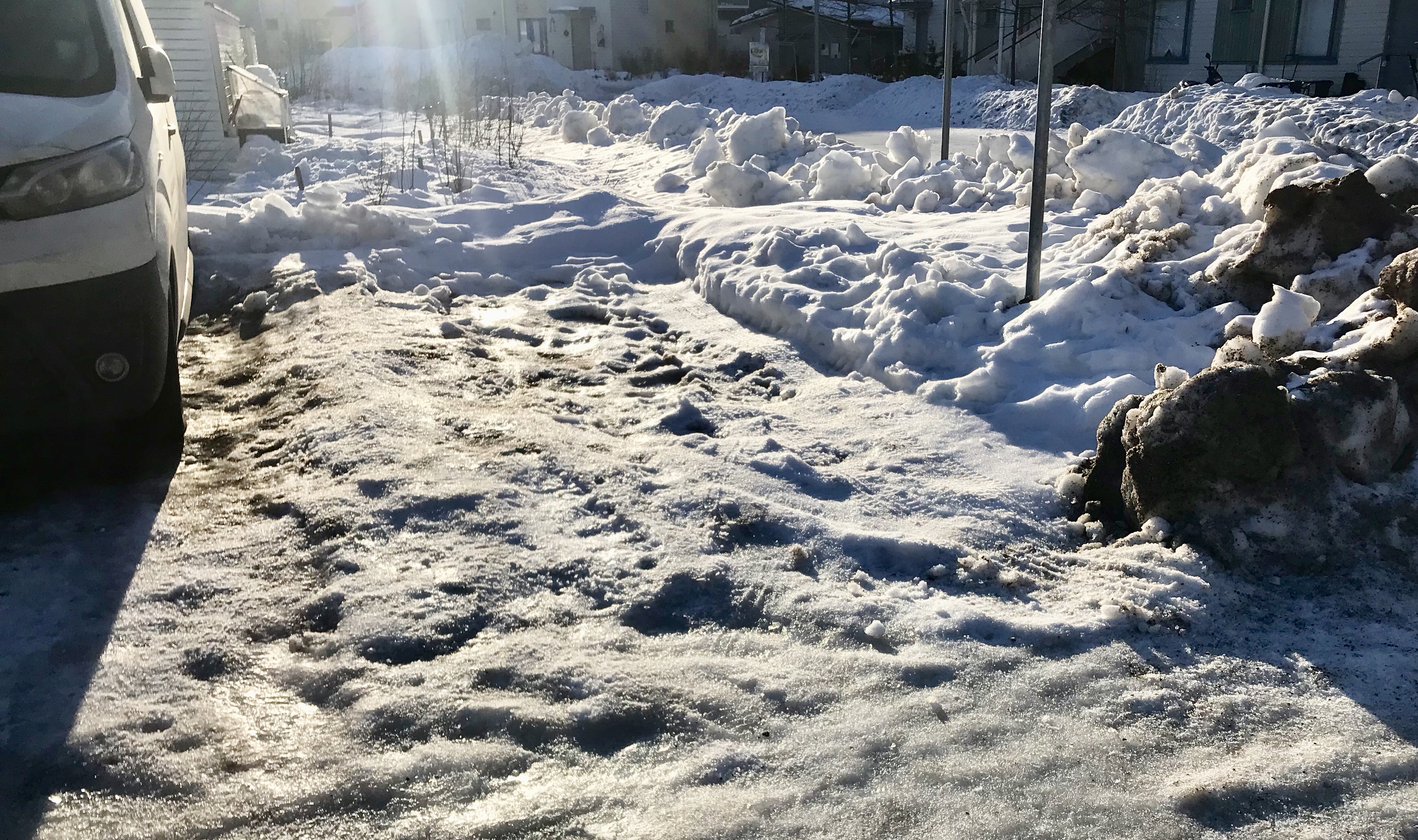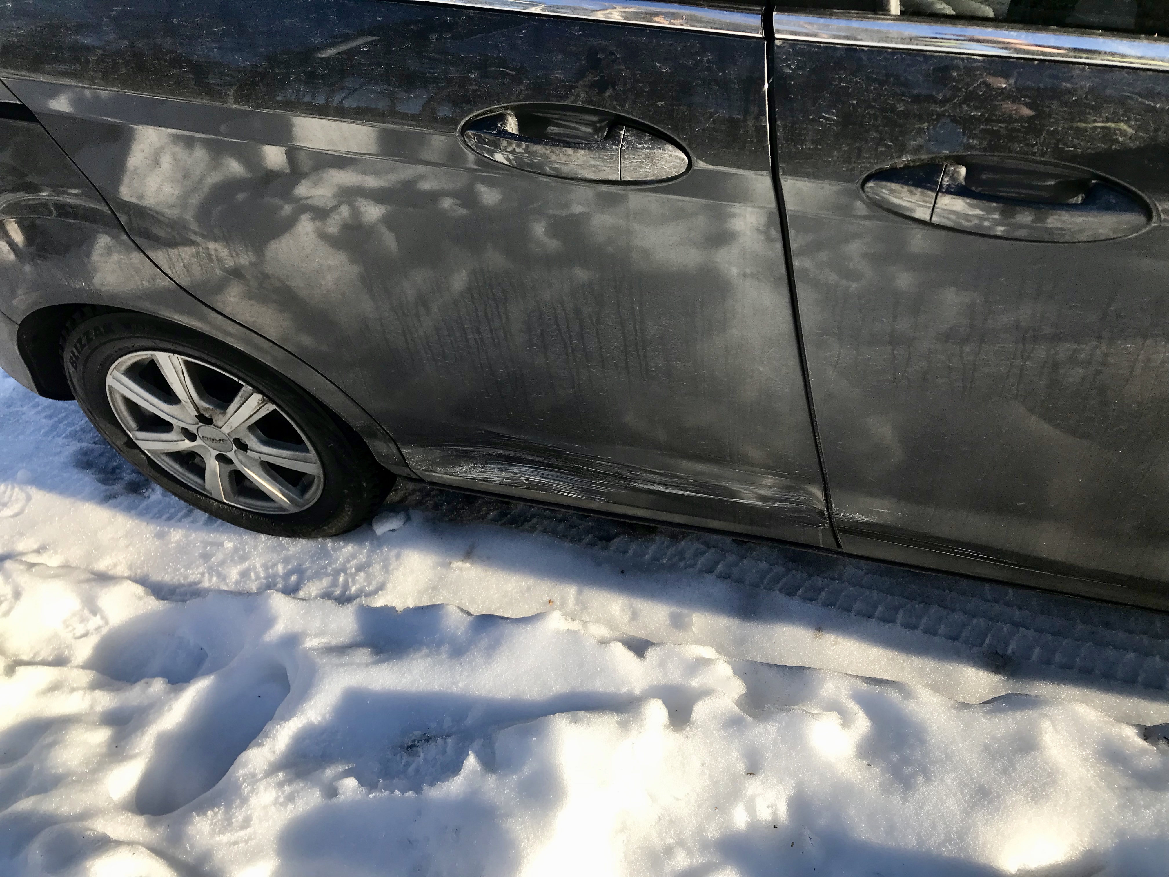 Skrapade upp bilen på ett sepelfyllt isblock vid parkering inför skidtur. Slarv! Förorsakar självförebrående.