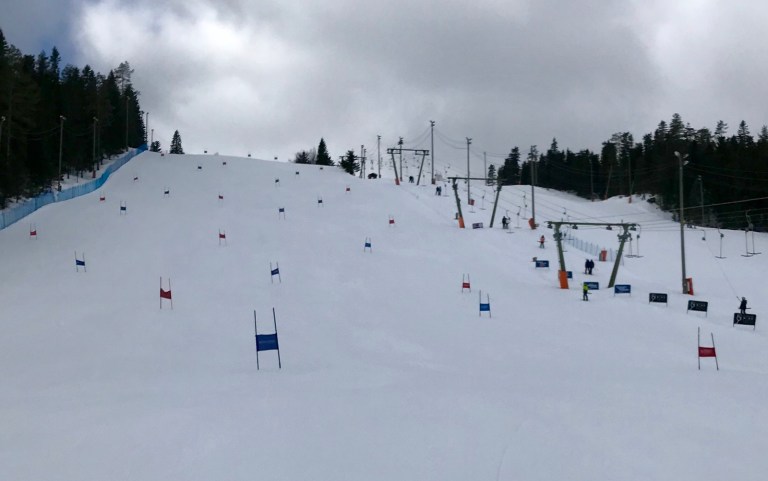Det blev storslalom. Först med långa skidor, sedan med kortare, sedan långa igen och till slut korta. Svårt att avgöra vad som är bäst. Tre parallella banor, vår är i mitten. Ryssarna har träning i de andra, och utgör också för övrigt majoriteten i backen. Besvärligt att hålla sig till den rätta rutten.
