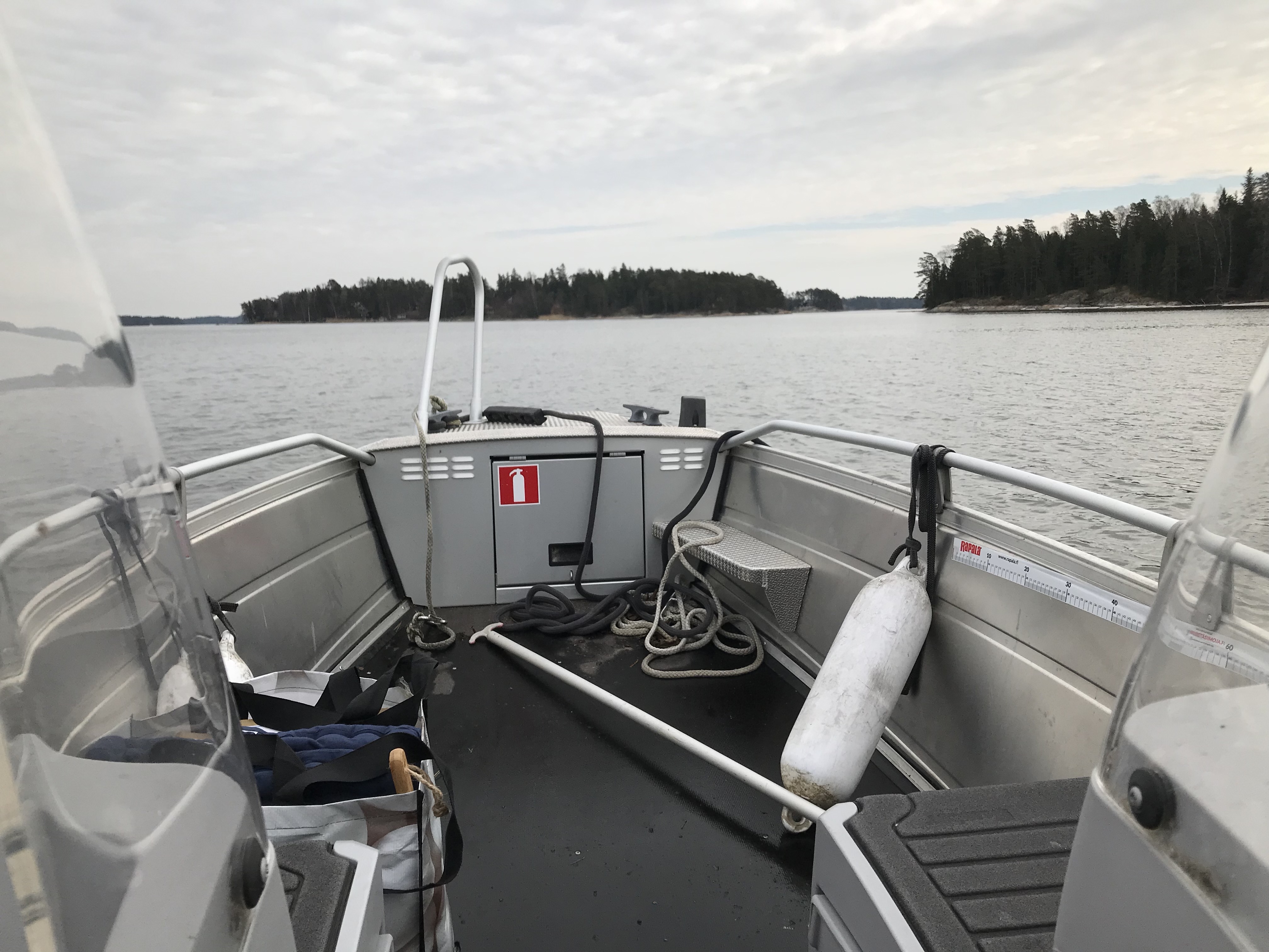 Vi tar bort presenningen och hakar fast trailern i min bil. Som vanligt fungerar inte ljusen som de skall utan blinkar lite hipp som happ. Vi kör iväg ändå och sjösätter på Björnsö. Automatpumpen kör genast igång och pumpar ut vatten. Hur kan det finnas så mycket vatten? Har någon kollat bottenproppen? Nej..
