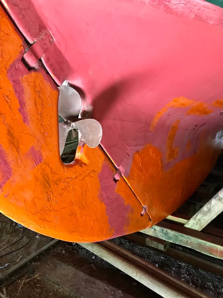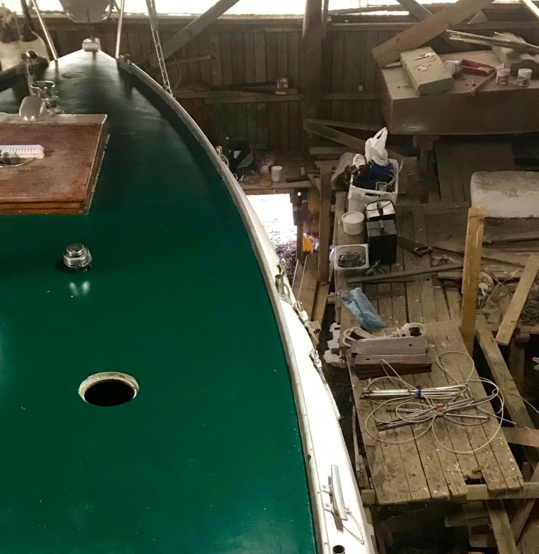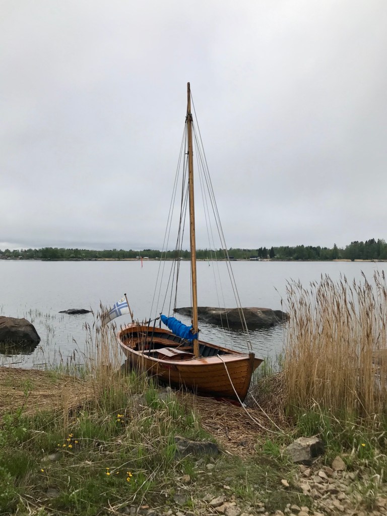 Härefter överläggning med Johan och Fredrik på varvet. Jag tar en burk blymönja och får hjälp med att fixa däcket. Också på cykeln alltså. Därpå rodd till Rummelgrund. Försynt slipande av bottnen. Mera fråga om att komma i rätt stämning. Träffar Thomas som jobbar på sin folkbåt. Vi sitter en stund och språkar i Freja innan jag ror iland.