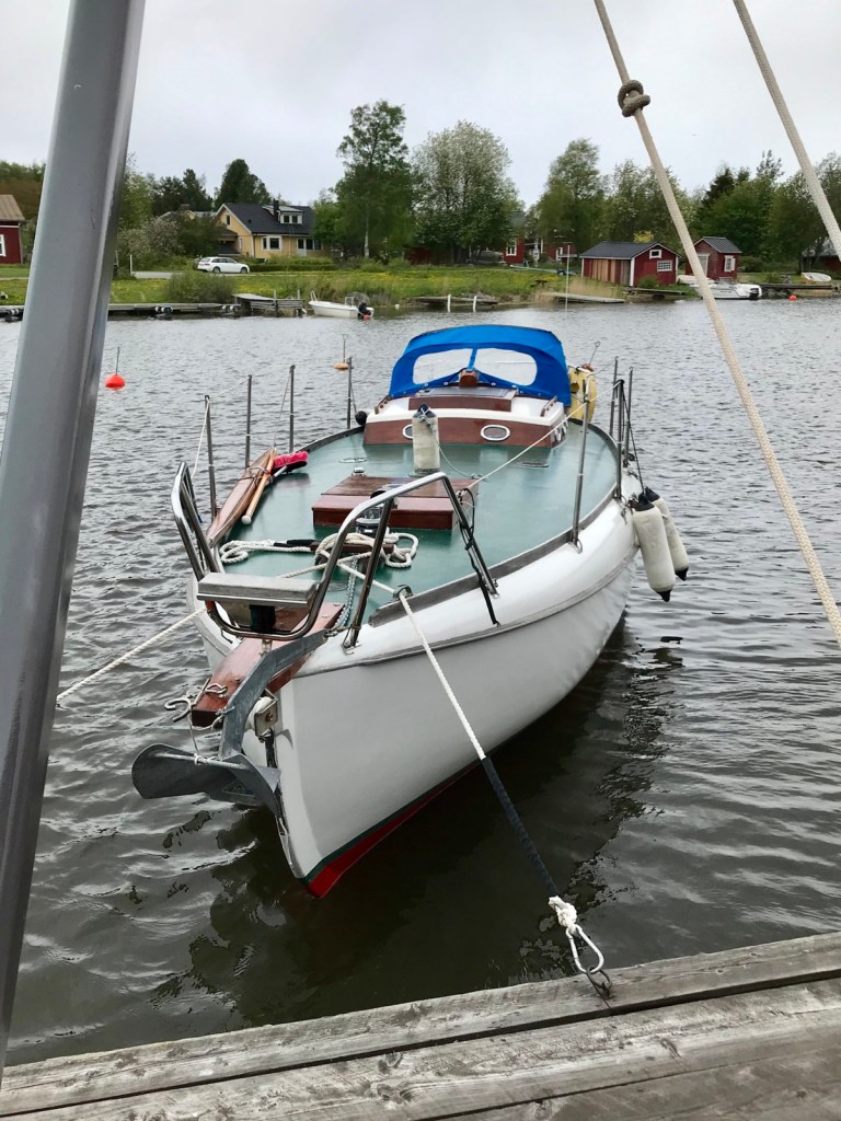 men lugnt ombord och på varvet. Jag småpysslar och fejar. Fredrik bjuder på kaffe både på morgon och eftermiddag. Tuomas ringer och säger sig vara på väg till varvet med sin fru. De sitter en stund i Freja och njuter av stämningen trots att inredningen är på hälft. Därpå går vi alla och beundrar Fredriks nybygge.