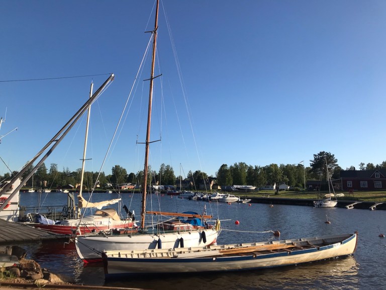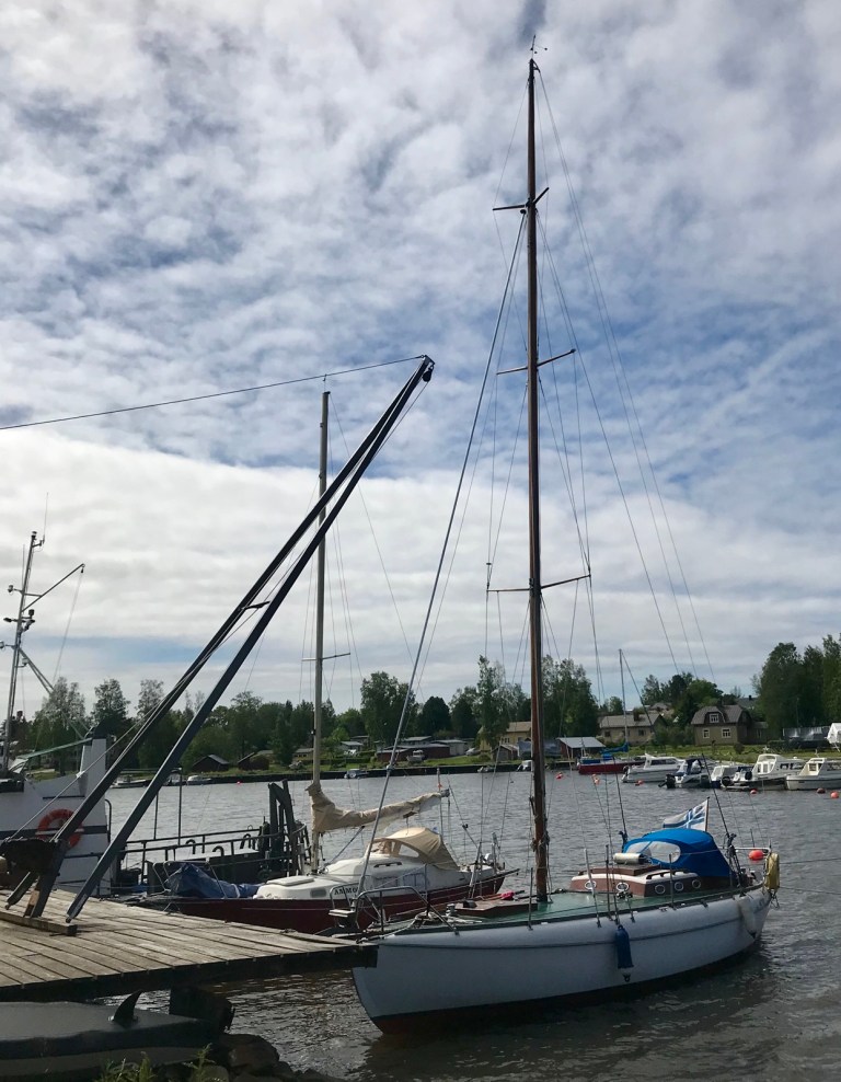 Några lacklager har påförts och båten glänser. Jag börjar förbereda Frejas mast för lackning. Fredrik kommer och frågar om jag hänger med till Vegana på lunch. Jag tackar ja och vi pedar iväg. Jag passar på och handlar lite att äta ombord.