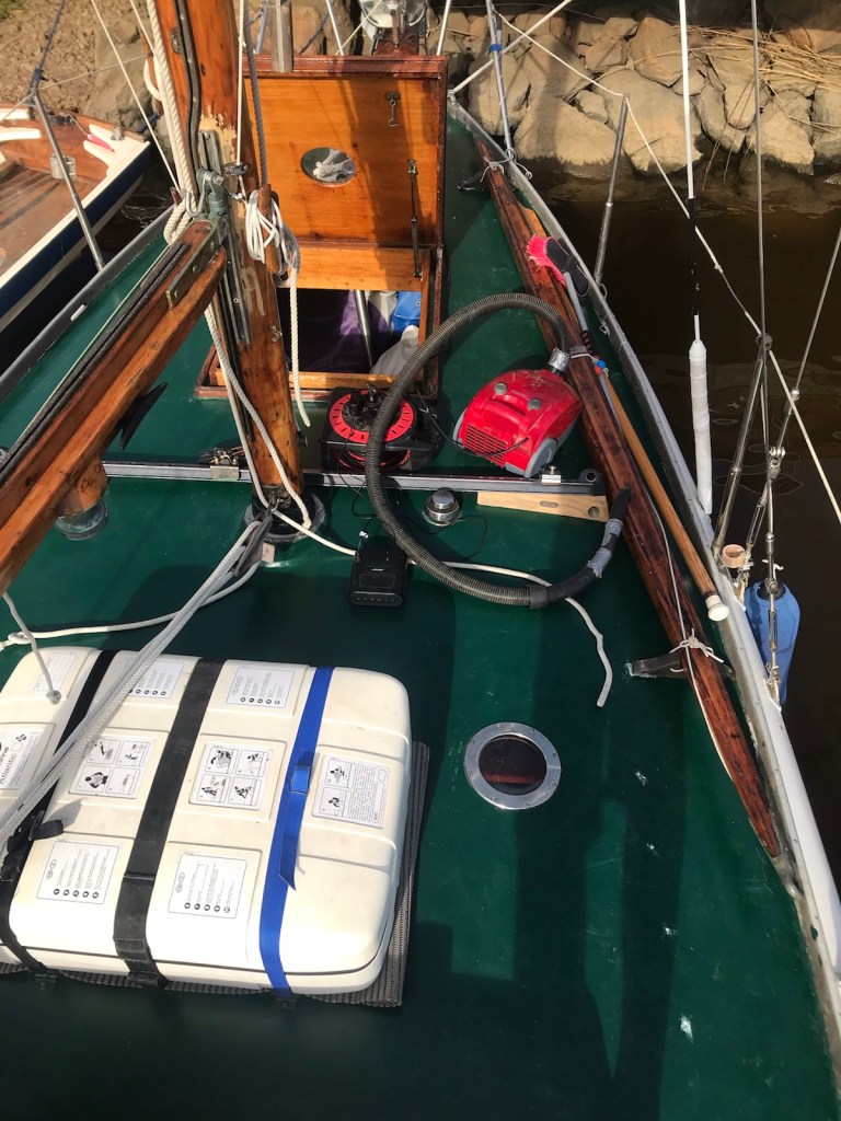 Tuomas ringer och föreslår en seglats nästa dag. Jag fyller igen hål i däcken för skotskenor som inte används. Dagen var småhektisk med alla göromål. Nästa dag, som, när jag skriver detta, är idag, är jag igen tidigt uppe. Efter morgonmål ombord och dusch på klubben cyklar jag med nylappad cykel till K-handeln och provianterar. Jag äter laxröra ombord och utför slutstädning. Seglen skärs i. Lanternan med rött och grönt ljus får jag inte att fungera.
