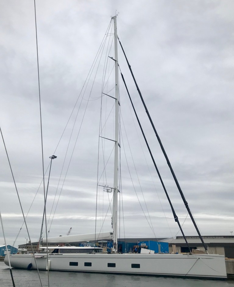 Strax kommer Tuomas med sin son Aako. Vi kastar genast loss och åker iväg. Seglen hissas utanför SSJ. Det bär av med fart för den ostliga vinden. Vi passerar Baltic Yachts och fotograferar den enligt mitt tycke fula men stora segelbåten som står utanför.