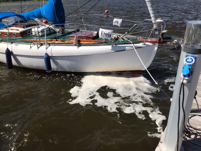 The water outside Jakobstad is dirty and has discolored the white hull. I try to clean it with the deck-brush. Not very successful..