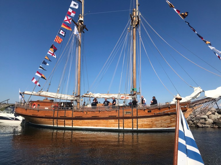 När jag kommer fram ser jag bojar, men skutan Ansio har lagt sig längs med bryggan. Jag åker fram och hör mig för, de säger att de är på väg inom en halv timme, jag kan ta en boj under tiden. Det gör jag, och innan jag hunnit vika seglen åker de iväg och jag kan ta iland.