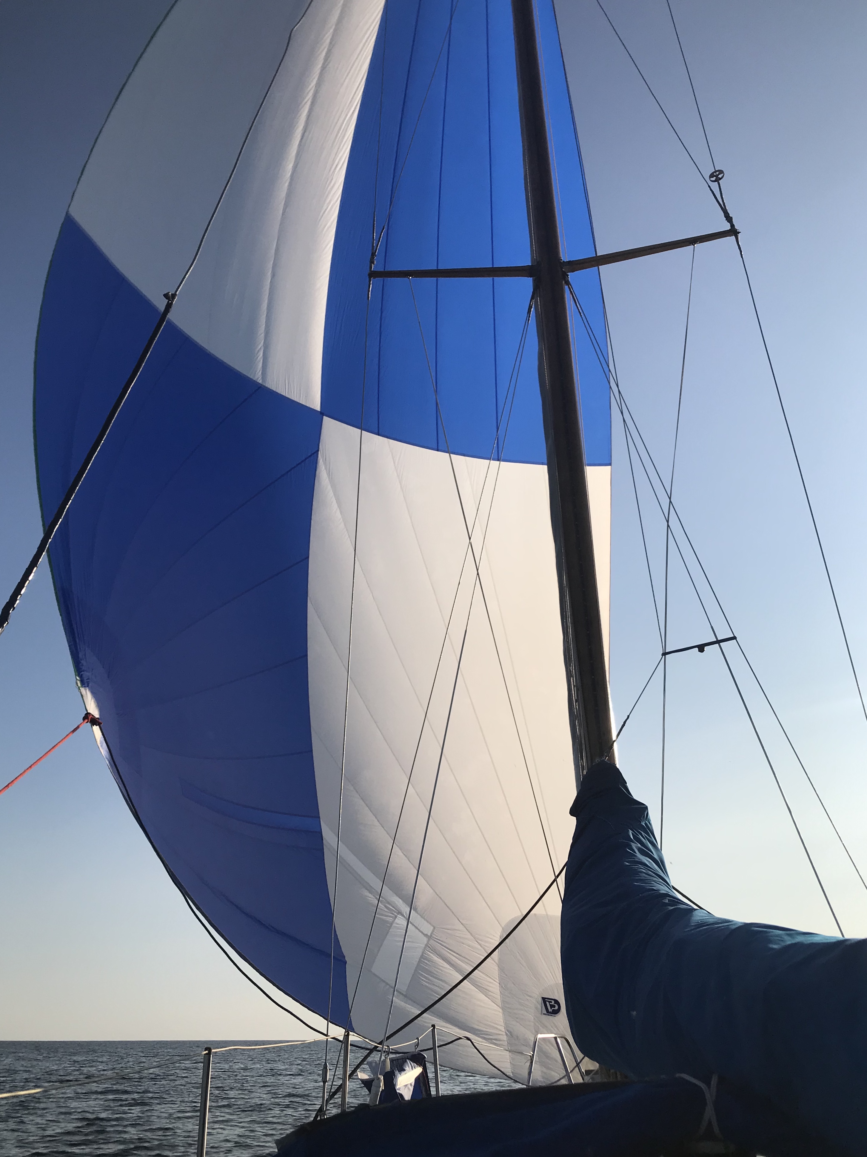 Det blåser ännu lite, jag hissar bara gennakern i den lätta brisen. Snart möter jag den första och enda nöjesbåten under två dagars seglande. Ingen trängsel på Bottenviken i medlet av juli. Strax härefter dör vinden ut och jag tar ned seglet. Det blir motorgång resten av dagen. Trist. Jag gör en massa arbeten ombord medan autohelmen sköter styrandet. Den är bättre på att hålla kursen än jag.