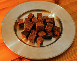A RUSK is a hard, dry bisquit or a twice-baked bread. It is sometimes used as a baby teething food. In some cultures, rusk is made of cake, rather than bread; this is sometimes referred to as cake rusk. In the United Kingdom the name also refers to a wheat-based food additive. (Wikipedia)