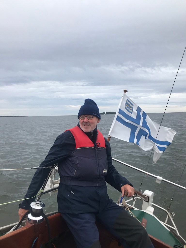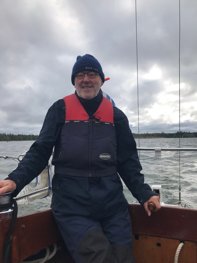 ..10 m/s från nordväst när vi lämnar Tankar. Vi fick bada bastu med båtbyggare kvällen innan och känner oss renade. Den signifikanta våghöjden är betydande trots att vinden vänt under natten. Vi forsar fram för bara genua mot det inte faret där såväl sjögång som vind känns lättare.
