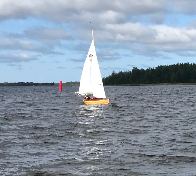 När vi kommer till djuphamnsfaret in till Jakobstad styr vi upp mot Mässkär och hissar storseglet. Strax möter vi Fredrik som länsar emot. Vi fotar varandra..