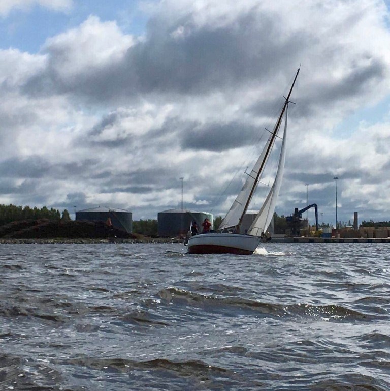 Kvällen är vacker, men solen går ner i moln. På morgonen vaknar vi till mulet och fuktigt väder. Efter morgonmålet kastar vi loss och sträcker mot Jakobstad.