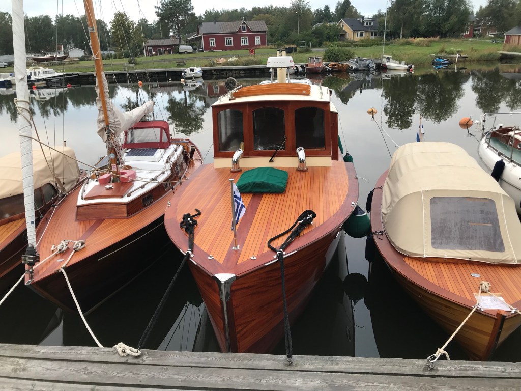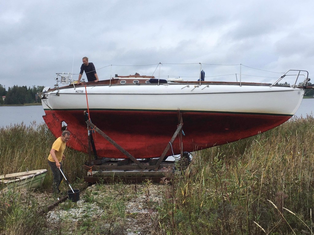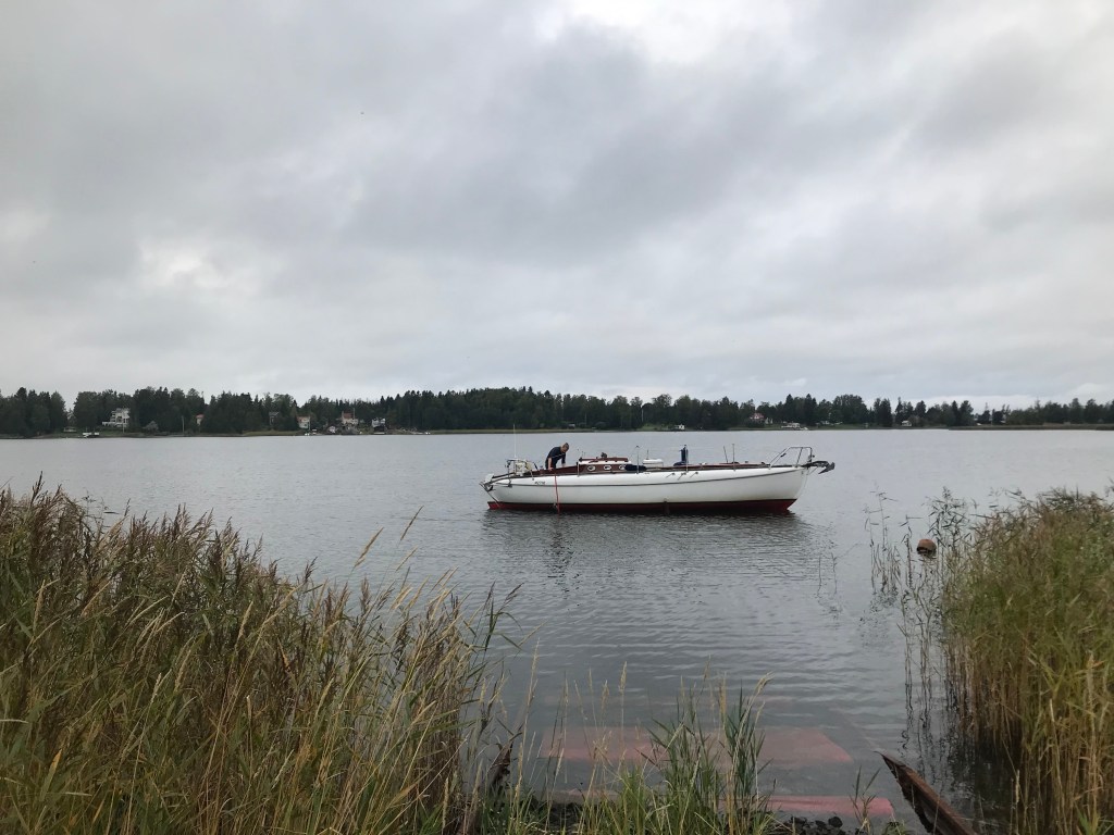 Med rutin från förra hösten får vi ganska behändigt in båten i skjulet. Tuomas ror Fredrik iland medan jag småpysslar ombord. Kör glykol genom systemet t.ex. Boris och Fredrik tycker inte att jag behöver byta olja varje år. Tuomas tycker att motorn uppför sig konstigt. Jag vet inte…