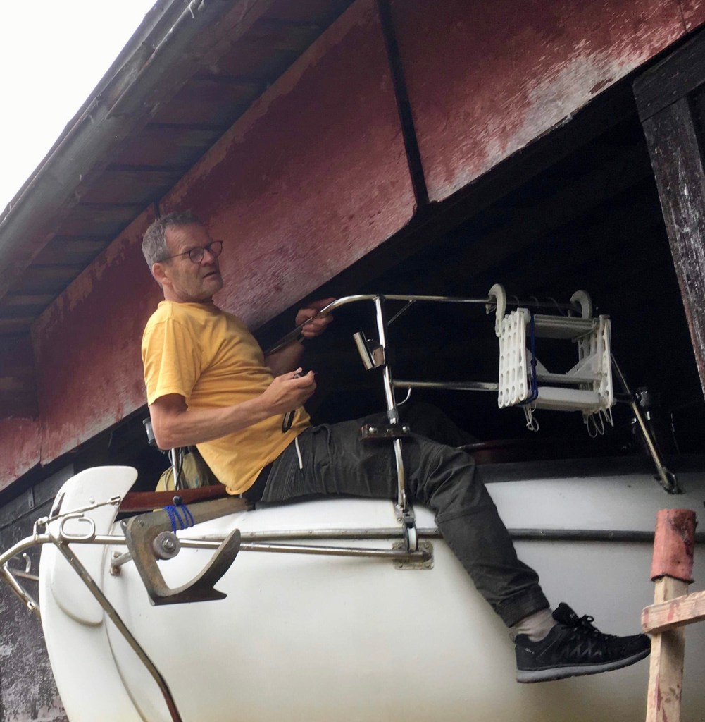 När vi vinschar in Freja i skjulet får vi igen skruva lös den övre dörrpanelen så kompassen ryms in. Den ligger högst då mantågsstöttorna är avlägsnade. Här funderar jag hur jag skall skruva den tillbaka. Fredrik gör det sedan med hjälp av en stege.
