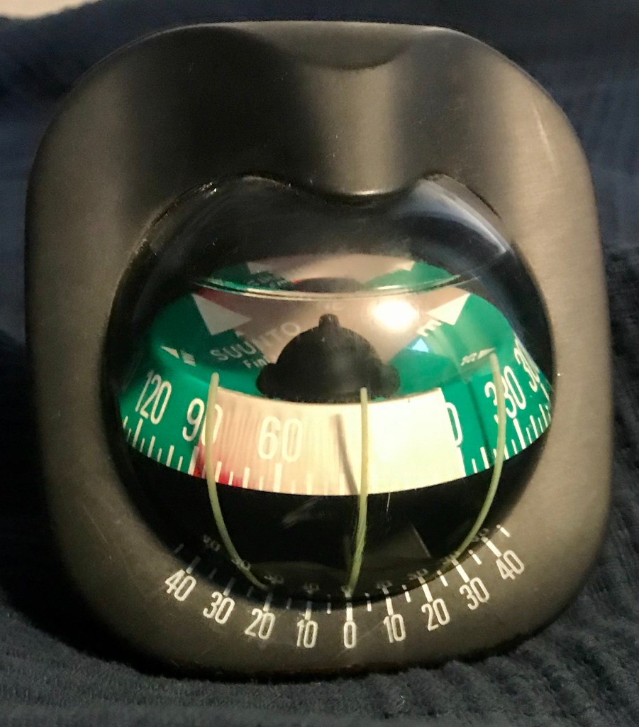 Jag tog bort kompassen inför skrapandet. Det röda har bleknat betänkligt mellan 0 och 90 grader. Så pass mycket att det är svårt att urskilja. Dessutom är det ganska mycket luft i globen. Suunto gör inte längre sådana kompasser. Ringer man till deras serviceavdelning och vill ha betjäning på svenska svarar en rikssvensk damröst att de inte hinner svara nu för de är ute och testar kompasser. Antagligen i Sverige. Så går det ofta om man vill handla på svenska i Finland. Man hamnar till bolagets lokalavdelning i Sverige.