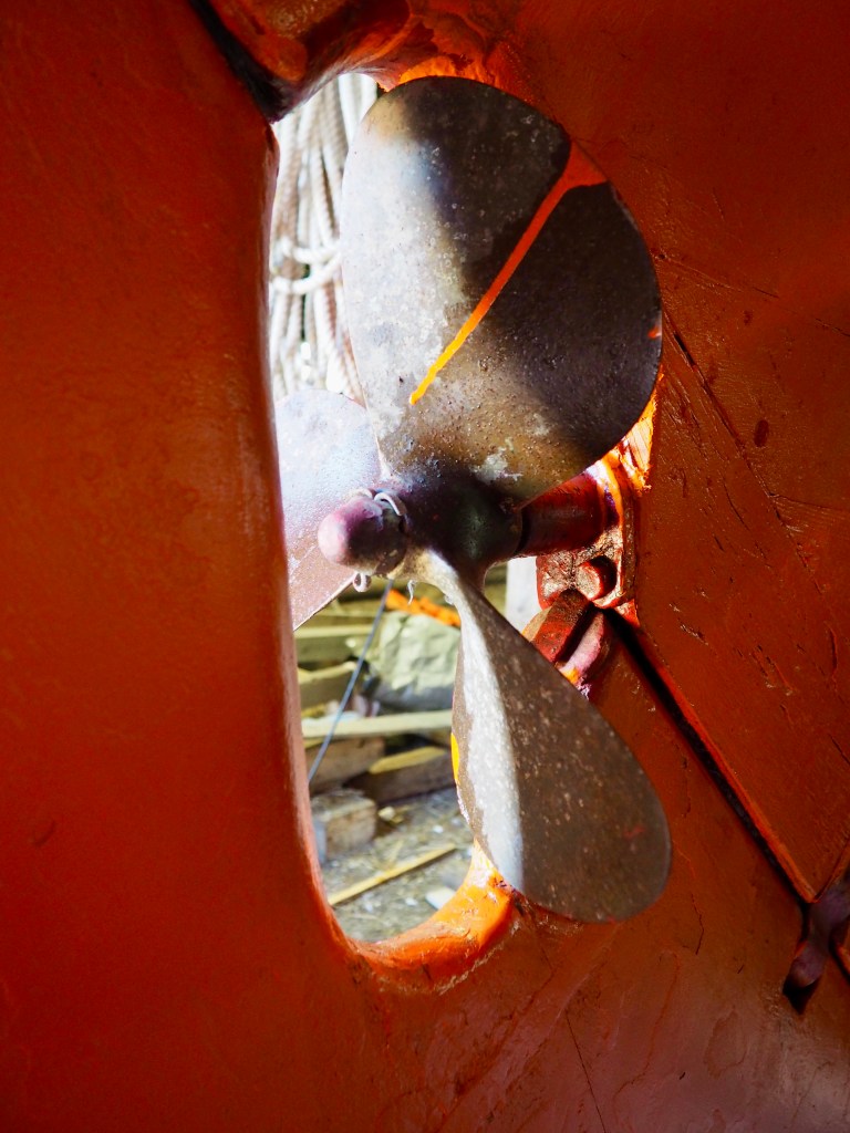 Bottnen blir aldrig så jämn som den borde, hur man än skrapar bort det lösa finns det alltid mera som lossnar om man riktigt försöker. Får väl bli att renskrapa nästa höst om allt går som det skall. Propellern har fått blymönja på sig och är anfrätt av oxidering. Som sista arbete idag borstar jag den med stålborste så den nästan blänker. Men det blev inget foto..