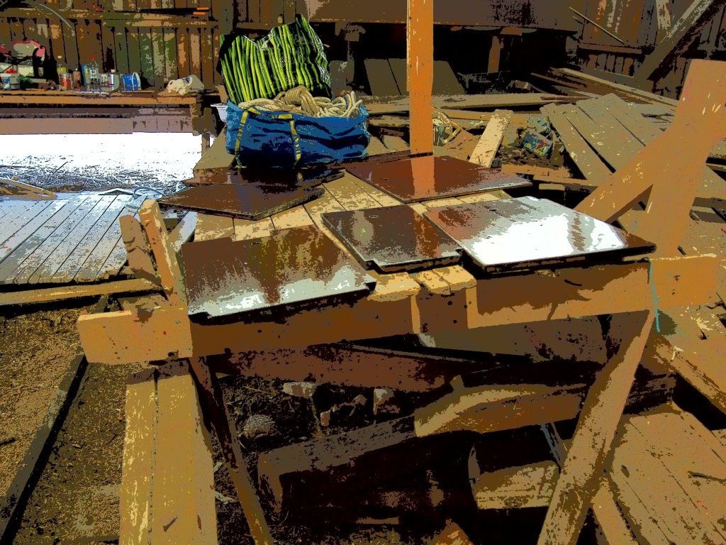Härefter lackas trallarna, denna gång på ovansidan. Medhavd lunch intas klockan tolv. Därefter ännu ett lager blymönja på kölen. Kaffe klockan 2. Gasspisen läcker, måste granskas. Om huvudkranen lämnas öppen kan lågan bli lite väl häftig då man tänder. Ibland.