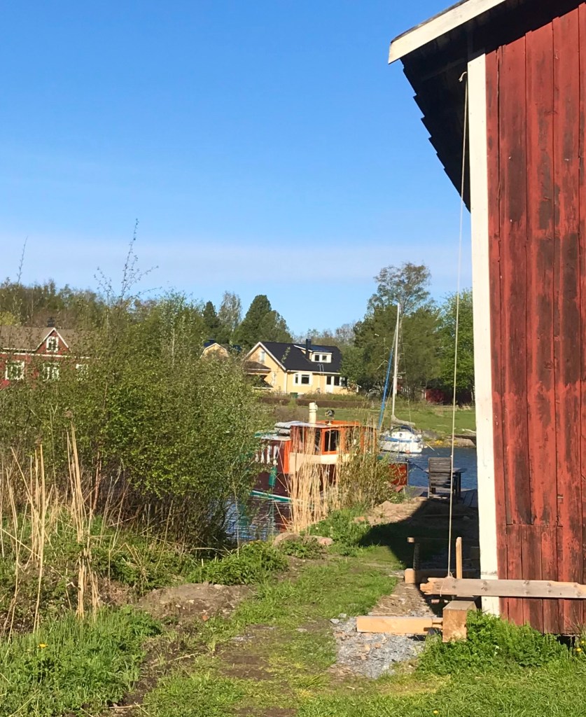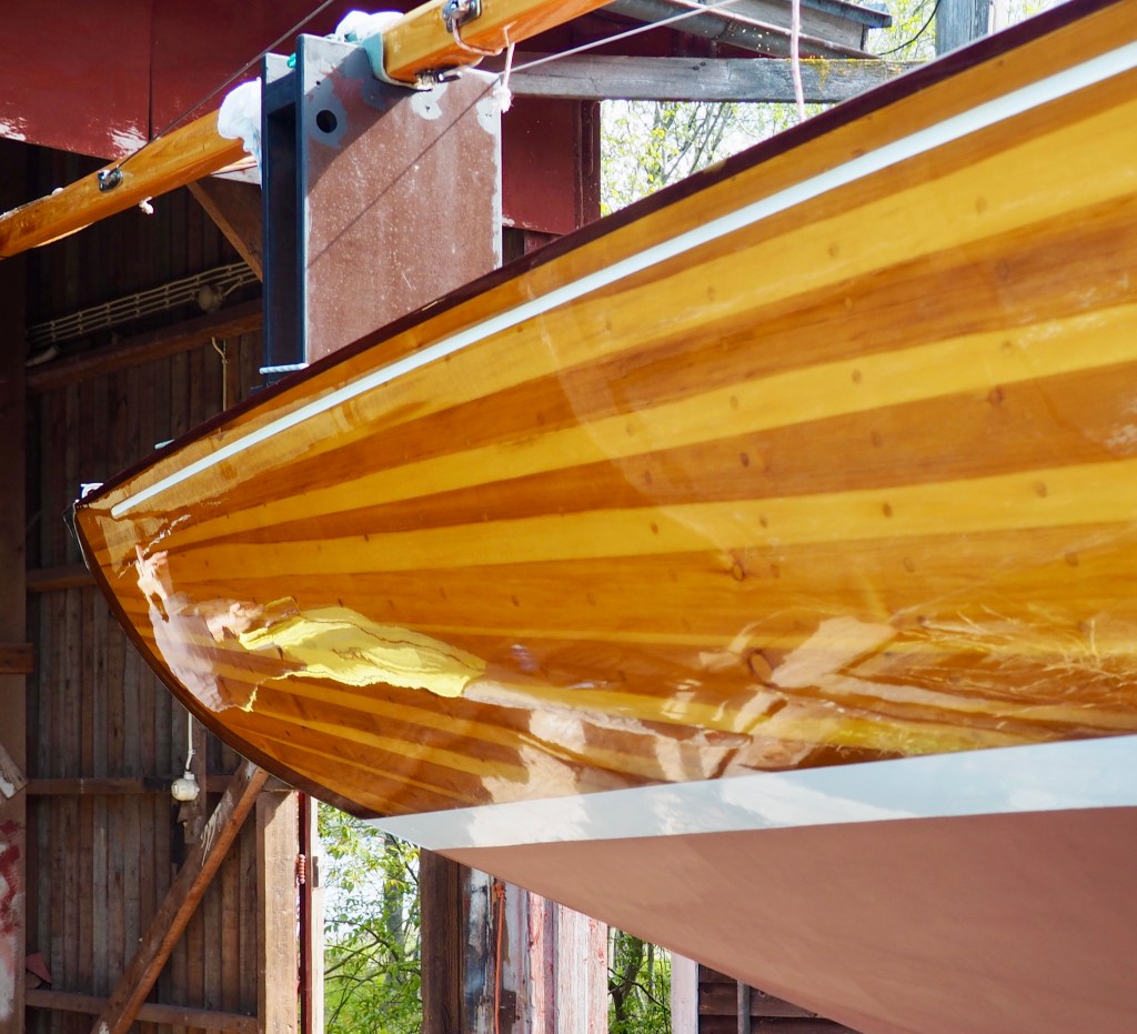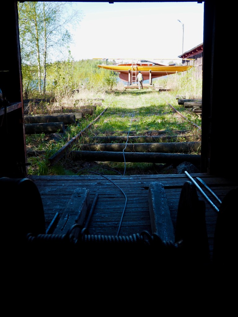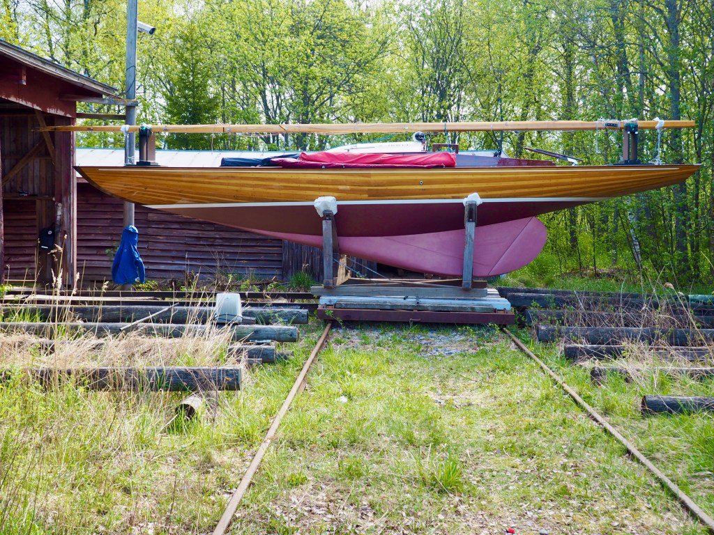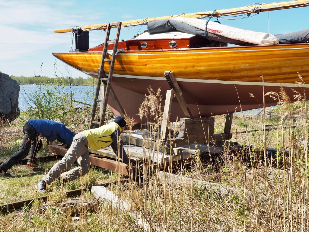 Därpå följande dag, torsdag den 28.5. är solig fast nordanvinden är kylig. På båtvarvet ser jag att salongsbåten är sjösatt.