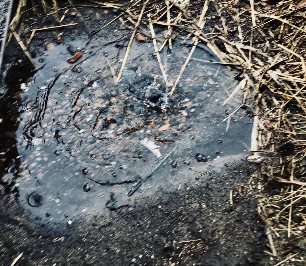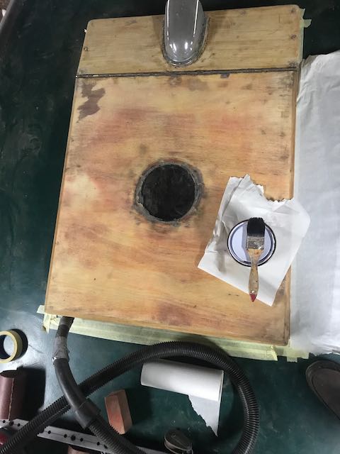Dagen inleds med att slipa förluckan. Hur mycket vågar man slipa, hur tjock är faneren? Fläckar här och var, delvis brända med varmluftsblåsaren när lacken skrapades bort på hösten. Antagligen kunde mera ha slipats bort, men man vet aldrig. Försöker täcka det värsta med bets. 3 lager.