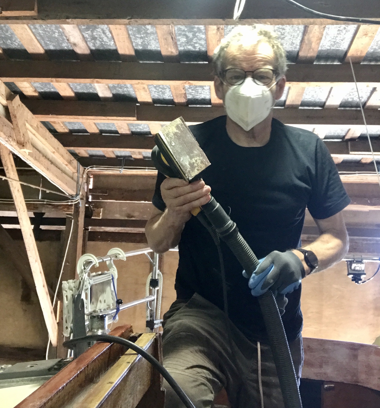 Tuomas kommer med buss. Jag dirigerar honom till båtvarvet, tänkte att han skulle få ta hand om masten som är upphissad i båtskjulstaket ovanför en massa ännu inte sjösatta båtar. Jag tar mig också dit och med förenade krafter lyckas Fredrik, Johan, Tuomas, jag och en okänd man få ner den och ut på gården.