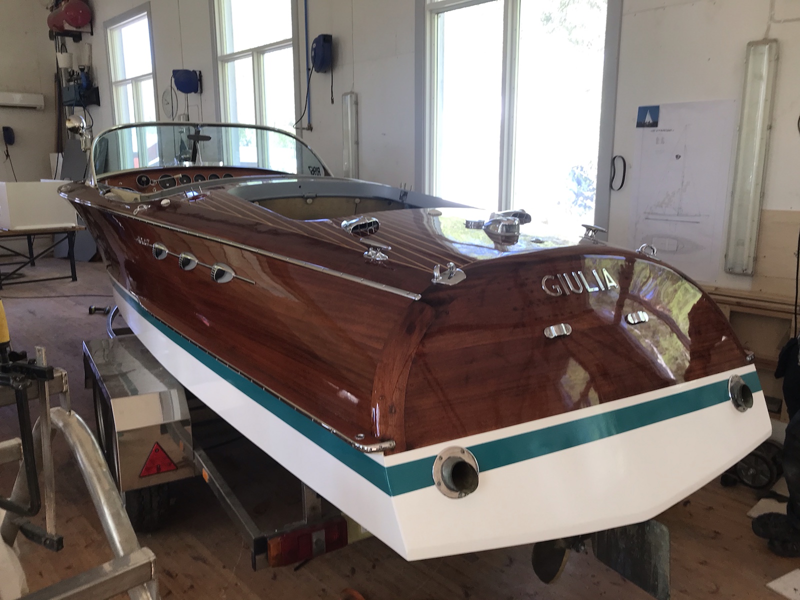 Tuomas är färdig med lackandet. I nya varvsbyggnaden håller Jyrki Järvilehto (J.J.Lehto) på att fixa med sin Riva. Eller egentligen dess trailer.