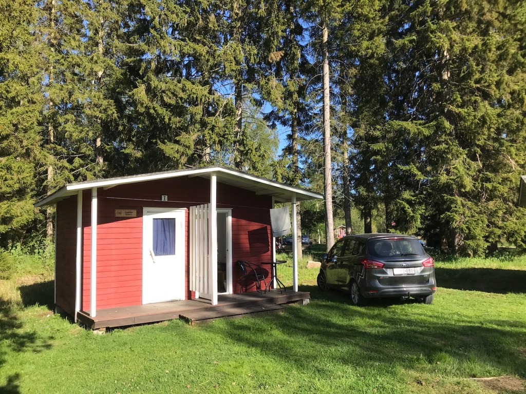 Därefter till Svanen Camping där jag hyrt en stuga. Först ett dopp i dammen. Badstegen är lös och livsfarlig så jag går i från kanotrampen.