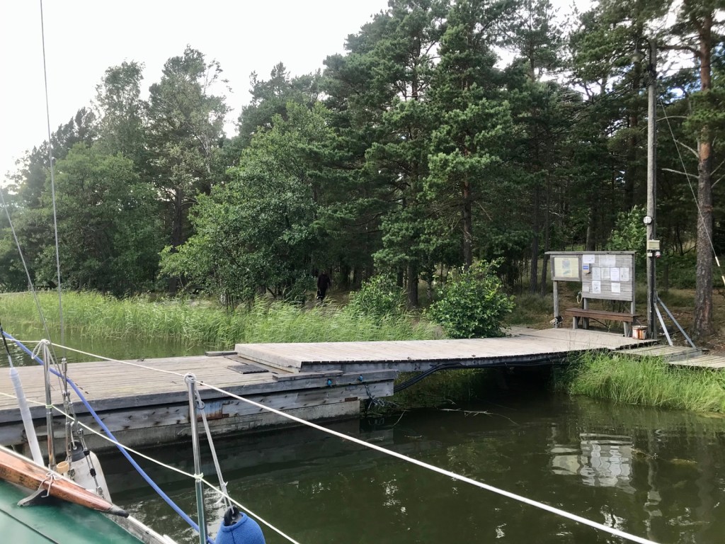 Vinden mojnar och vi startar motorn. Vi kommer på nytt ifatt 6:an som inte använder (har?) motor. De väljer Olympiafaret medan vi kör en rutt som Navionics valt. I smala sund och trånga passager. Sakta, sakta tills vi når Gölisnäs, ett nytt ställe för oss söder om Barösund. Det ser välfyllt ut och vi stävar igen innerst mot land. Där finns alltid rum.