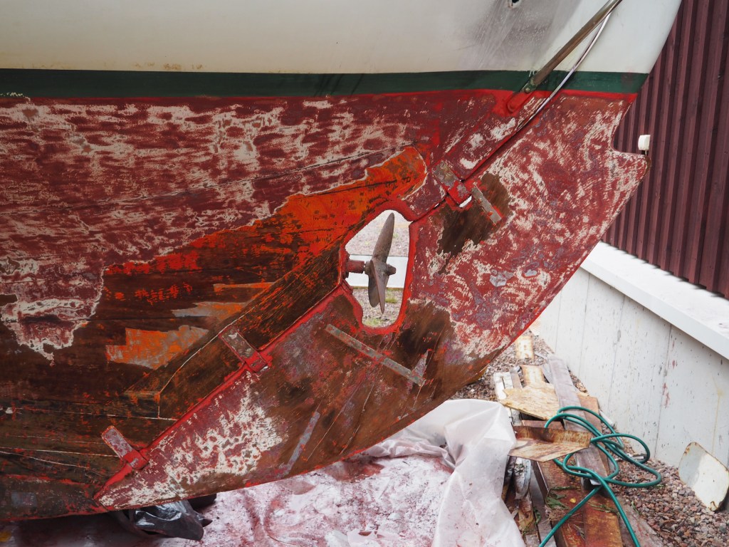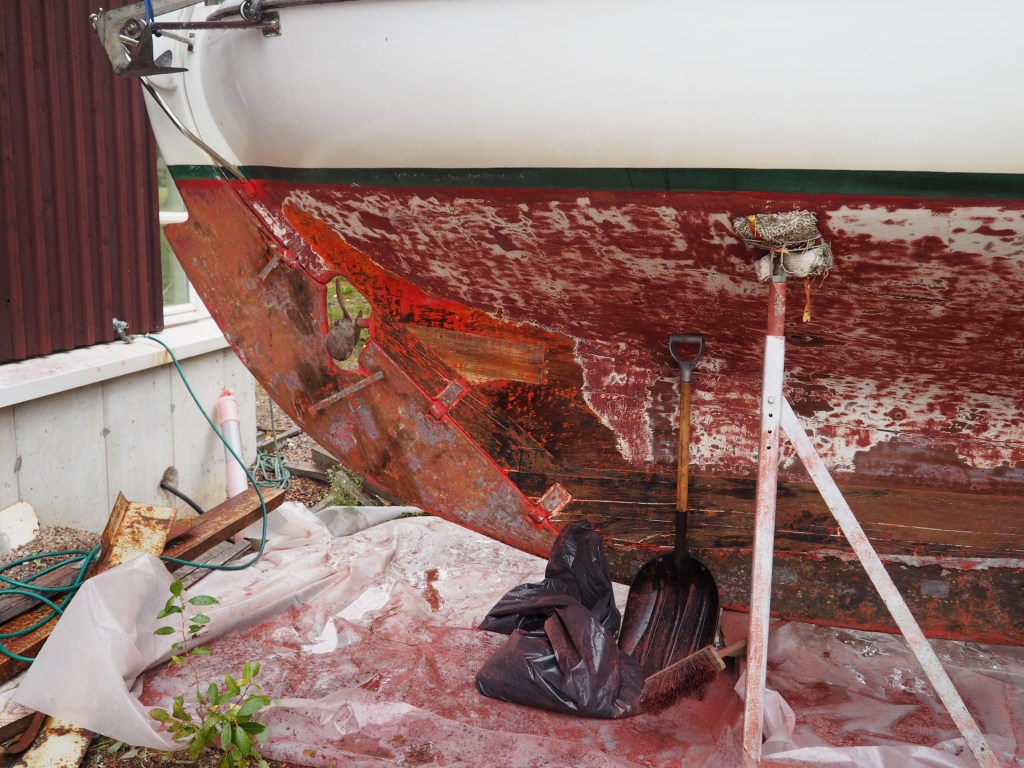 Det tar tre dagar att gå igenom bottnen med den. Gustav föreslår grovt sandpapper på en oscillerande (?) slipmaskin, men det får bli följande steg. Bloggvännen Lukasz säger att om man smälter NaOH-kristaller i tapetklister (kaustiksoda) och smetar ett tjockt lager på bottnen och efter en fikapaus tvättar bort det med vattentryck faller giftfärgen av på presenningen medan primern blir kvar. I Frejas fall har behandlingen framskridit så långt i det laget att det inte längre är aktuellt. Nästa gång kanske. Johan på Jakobstads båtvarv tycker inte att det är värt att slipa bort gammal bottenfärg där den inte lossnar.