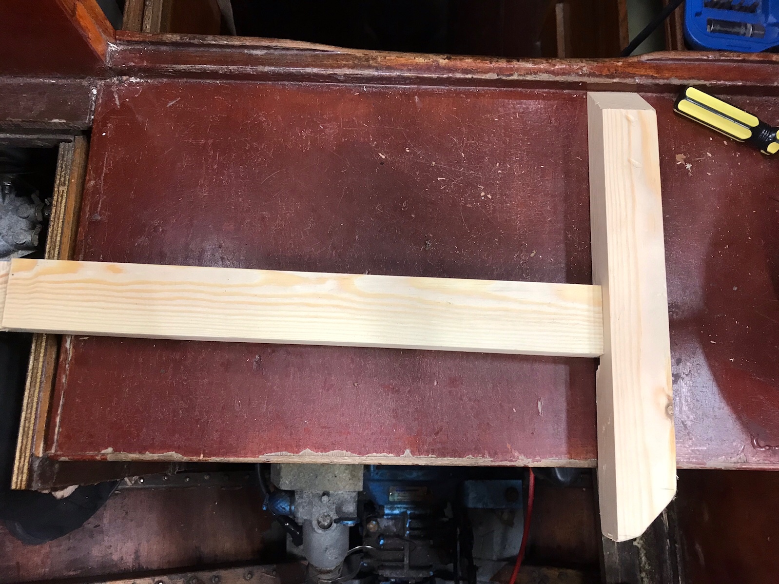Under helgen och på måndag morgon bör inhandlas skruvar, faner och rör till självlänsen. Rören bör korsa varandra och inte gå rakt ned på var sin sida som de gjort. Det har lätt till att vatten leds in i sittbrunnen då båten sydar.