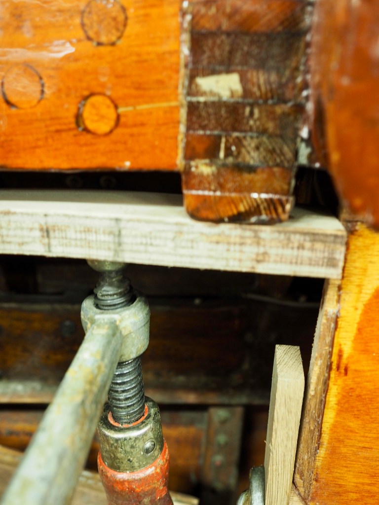 Limning med epoxi är veckans giv. Man måste vara snabb så man hinner limma allt innan epoxin stelnar. Ibland får man ta till nödlösningar och hoppas på att de håller. Mardrömmen är att när allt omsider är färdigt, och det första skuttet in i sittbrunnen tas, rasar hela korthuset..