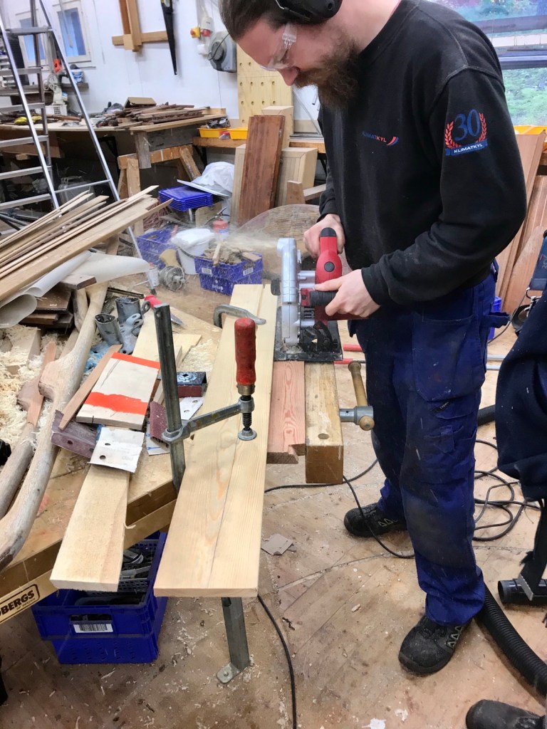 Stödkonstruktionen för durken limmas och skruvas fast. Skivan provas för n:te gången och ”vingarna” som skall gå in under sitsarna sågas ut och limmas fast.