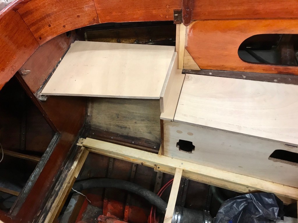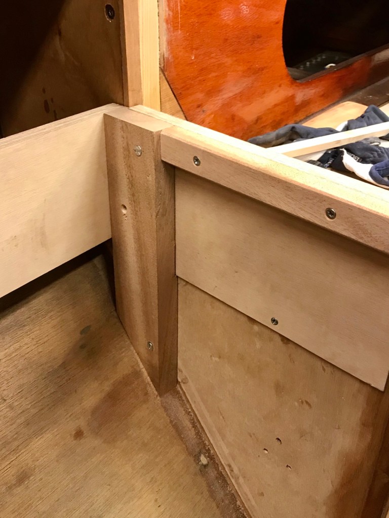 Dagens sista uppgift blir att lurka ut hur hyllan bakom babords styrtoft suttit. Det klarnar också att faneret som blir under hyllan inte behandlats med något. Det får bli morgondagen problem!