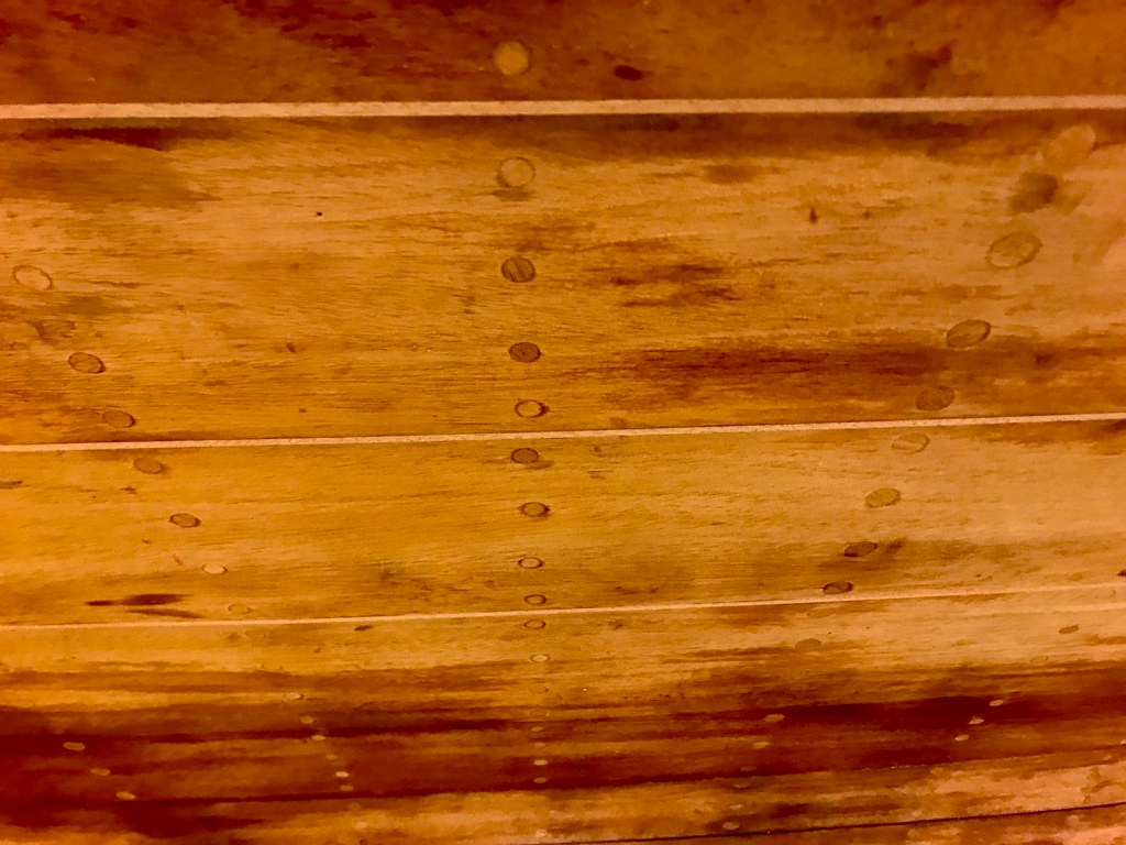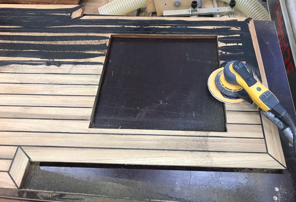 The teakgrinding and seamfilling continues. Toothpicks where the nails has been.