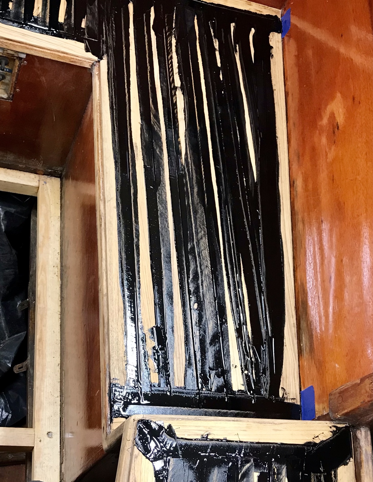 Pressing sealant in the seams between the teakplanks. A messy business!