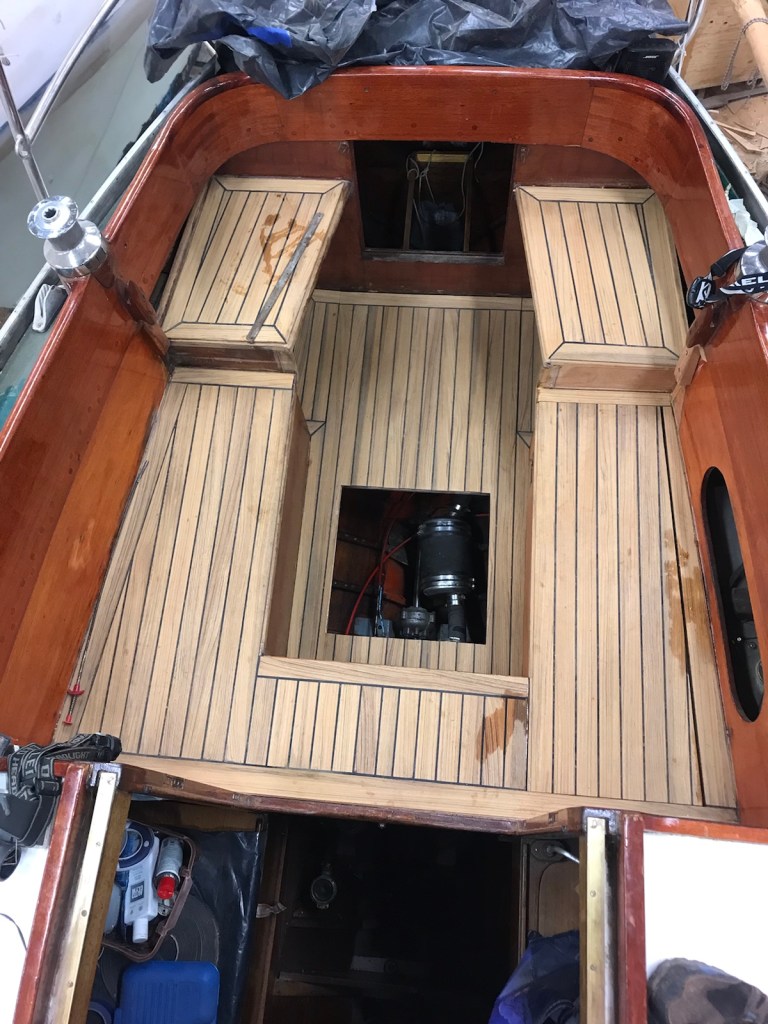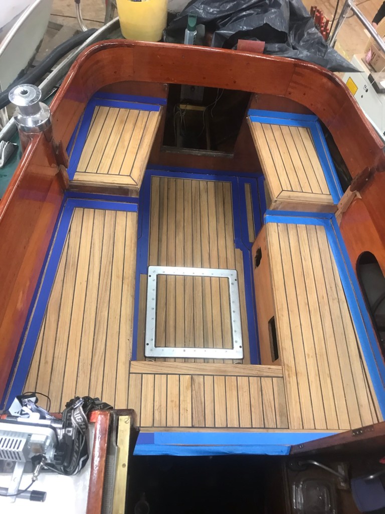 Mycket att göra. Börjar med att olja styrbords sida och fortsätter med babord. Sittbrunnens durk har länge blivit utanför, nu skulle det vara dags att integrera den.